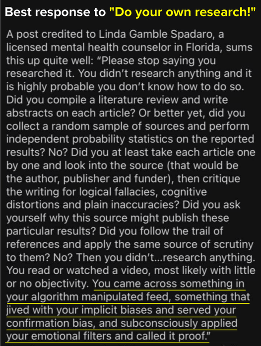 If you call out someone on their obvious use of debunked claims, and they say "I did my own research; you do yours!" then here is a meme you can send them in response.