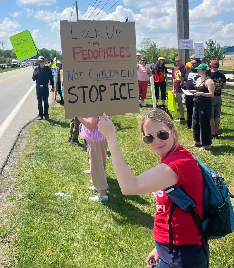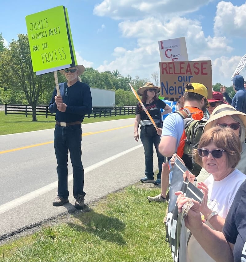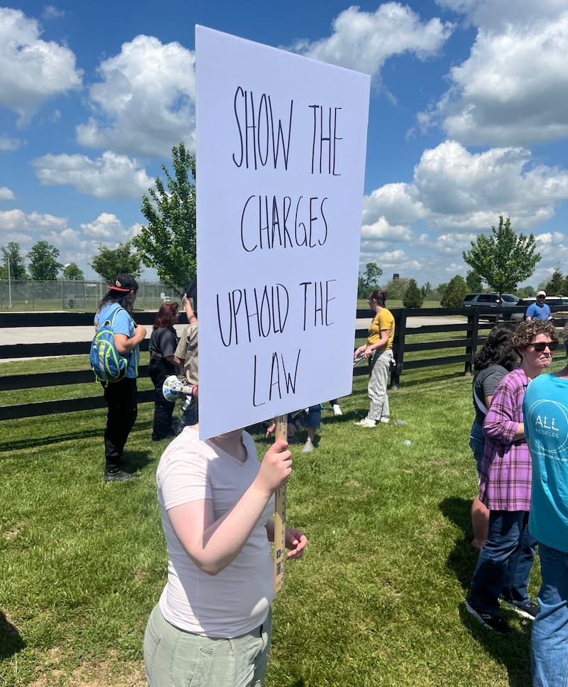 About 100 people showed up at the Oldham County Detention Center to call for the release of a young person being held by ICE, and to call for Oldham County to stop taking money from the federal government to hold prisoners for ICE.