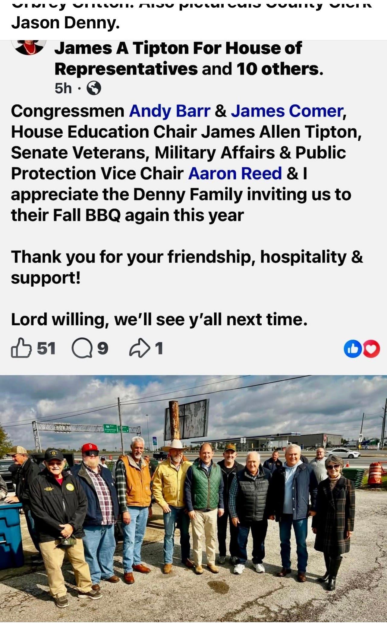 It is notable that Congressmen Andy Barr and Jamie Comer were able to be here because they are on vacation from Congress, since House Speaker Mike Johnson refuses to call them into session. They are also still getting paychecks, they have government health insurance, and it looks like they are using their time during the government shutdown to campaign.
