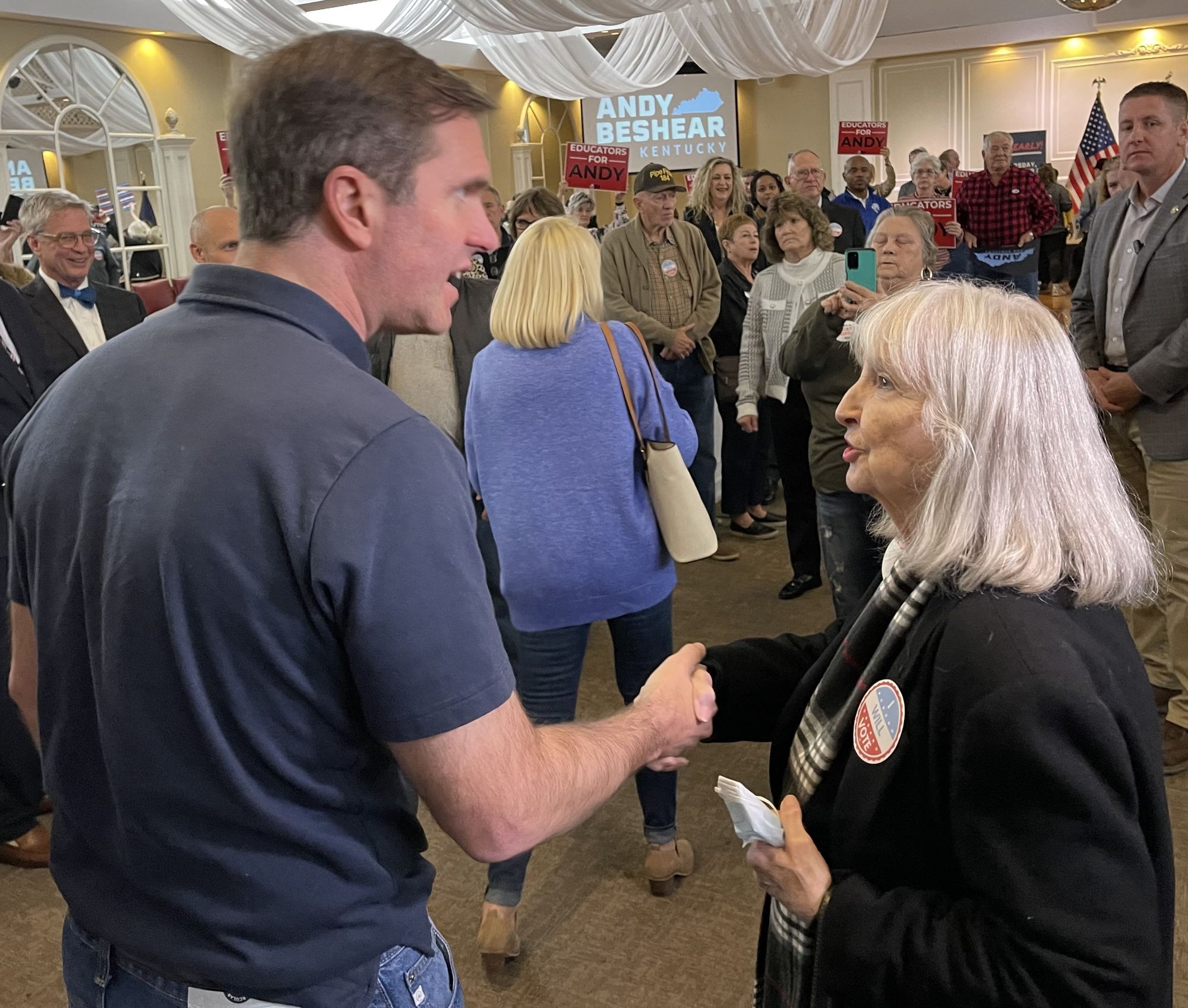 A footnote: the fundraiser included the typical catered meal and Beshear-for-governor signs handed out to the crowd for waving during the governor’s remarks. But also featured were little round red, white and blue stickers — with union labels — that said “I WILL VOTE.” Attendees who already had cast ballots were given a sticker on which “WILL” had been marked out and replaced with “ALREADY” and a “D” had been added to “VOTE.”