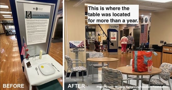 As I wrote last week, in a post titled “VA medical center petulantly removes ENTIRE ‘missing man’ table rather than remove Bible from it!,” a VA medical center in Kentucky had removed its entire POW/MIA, or “missing man,” table display from its lobby rather than simply removing the Gideons “New Testament — Psalms and Proverbs” from the table, which was all that a group of twelve veterans wanted the facility to do.