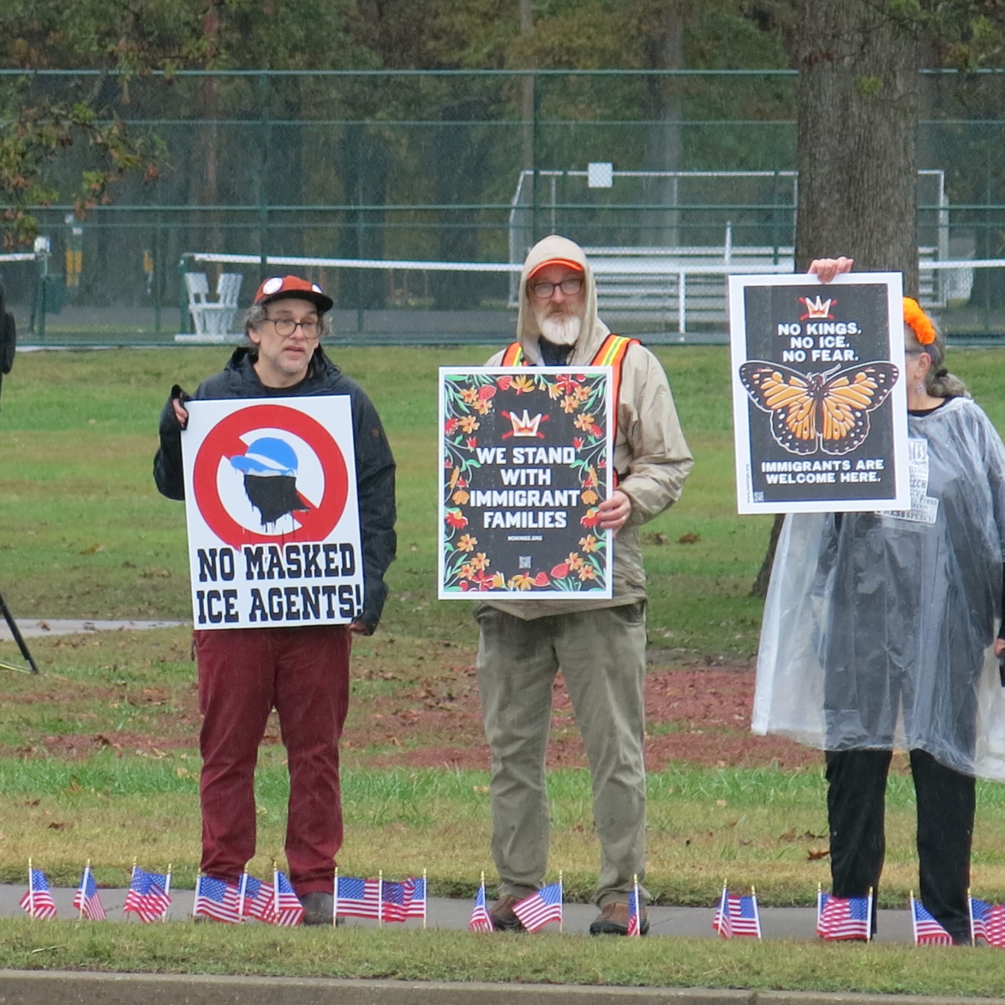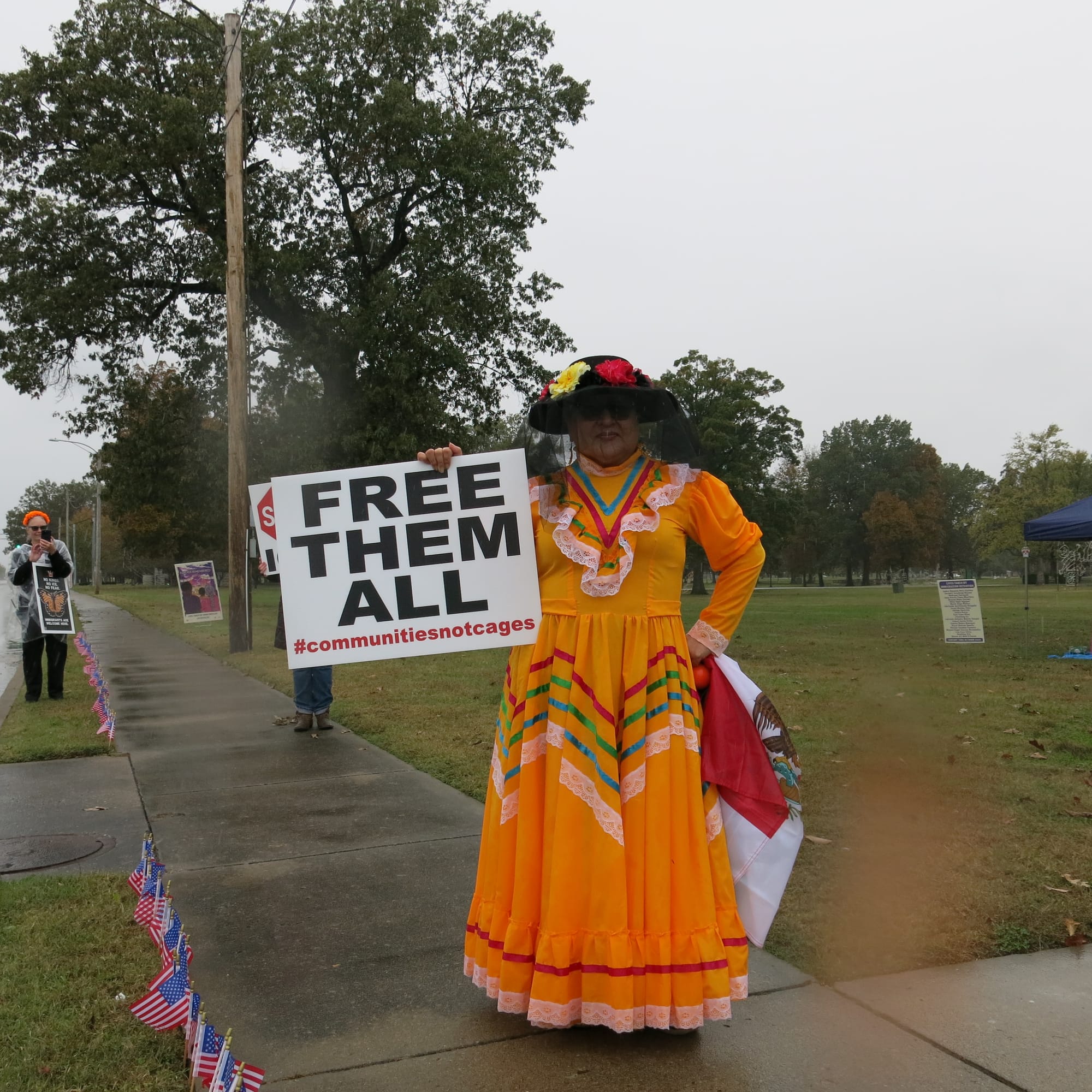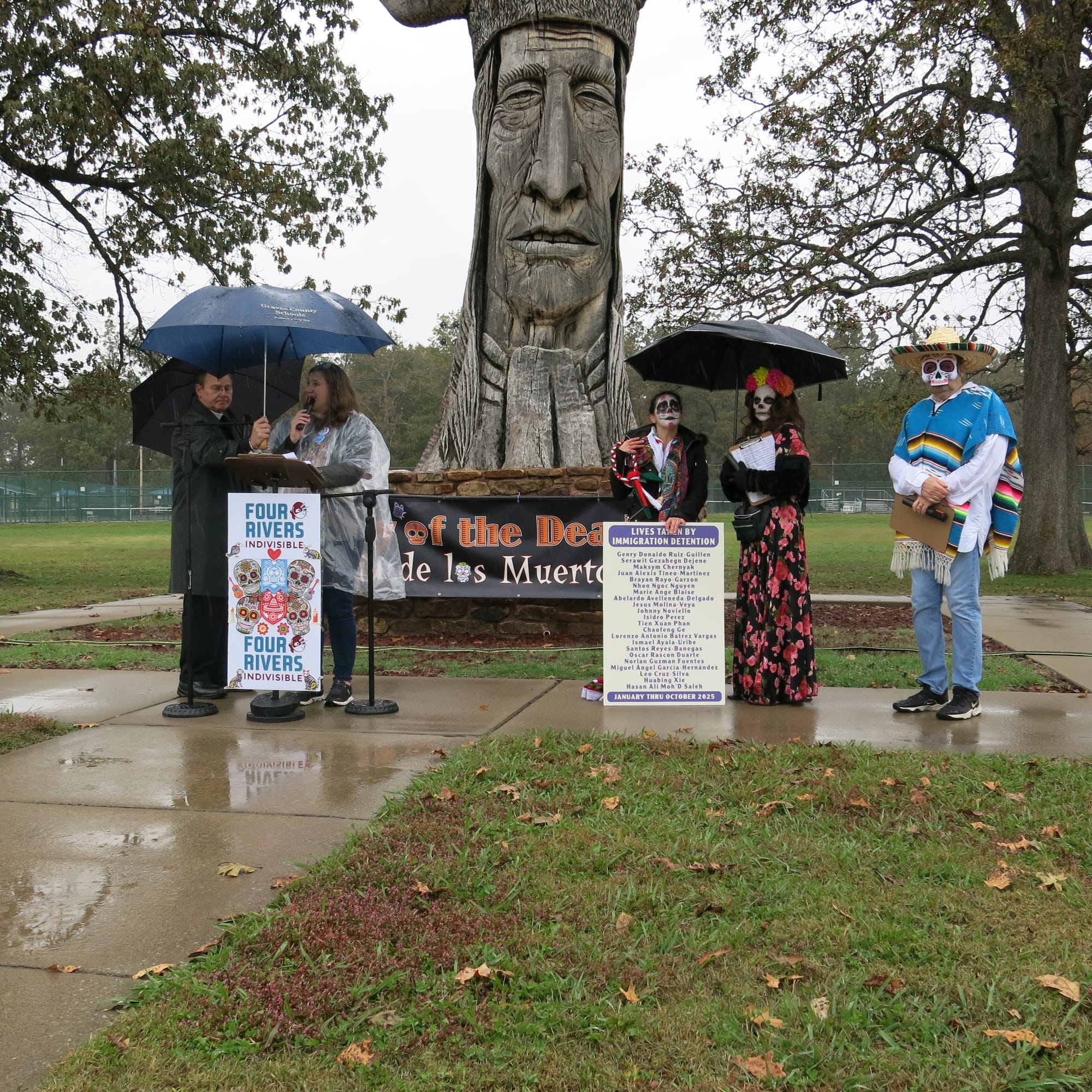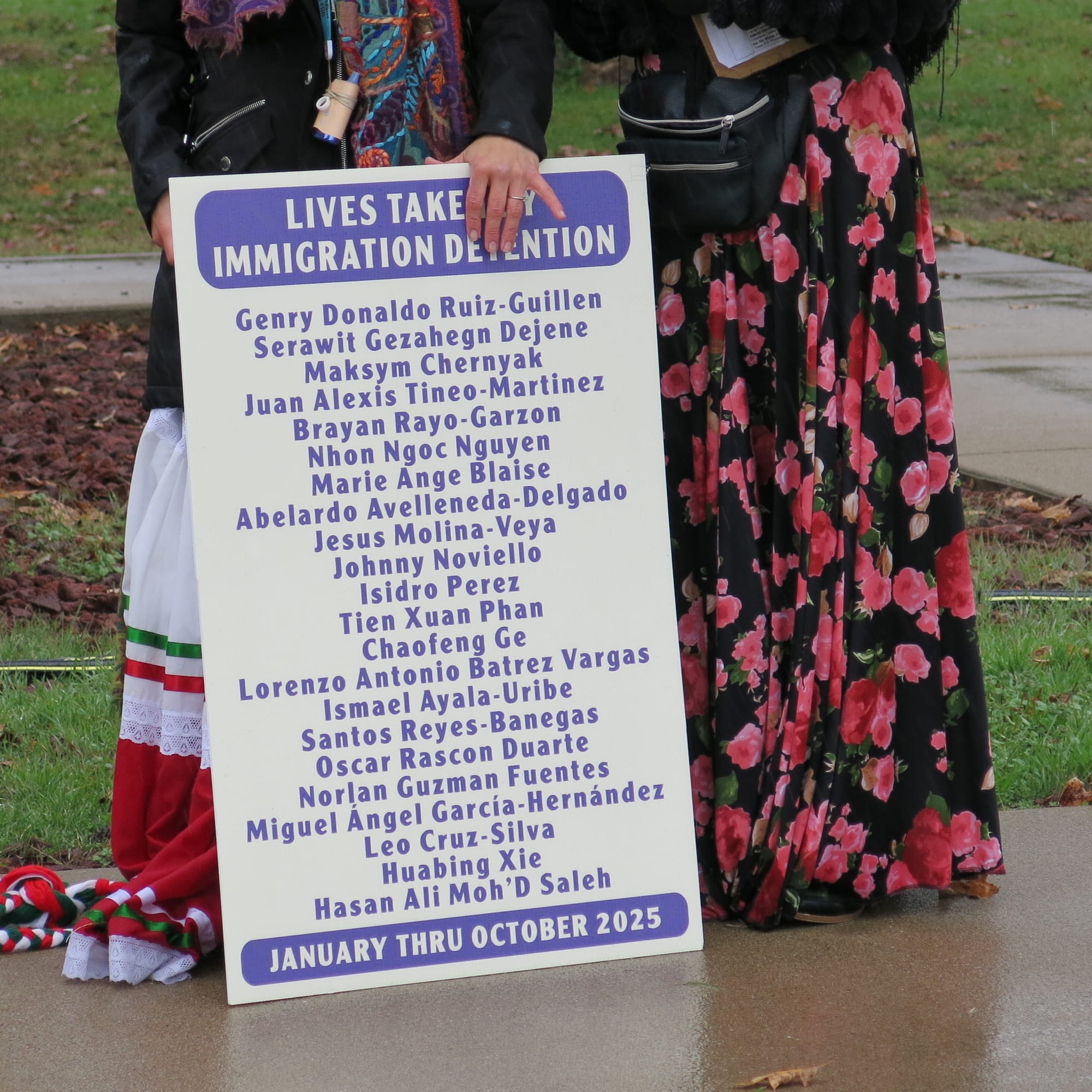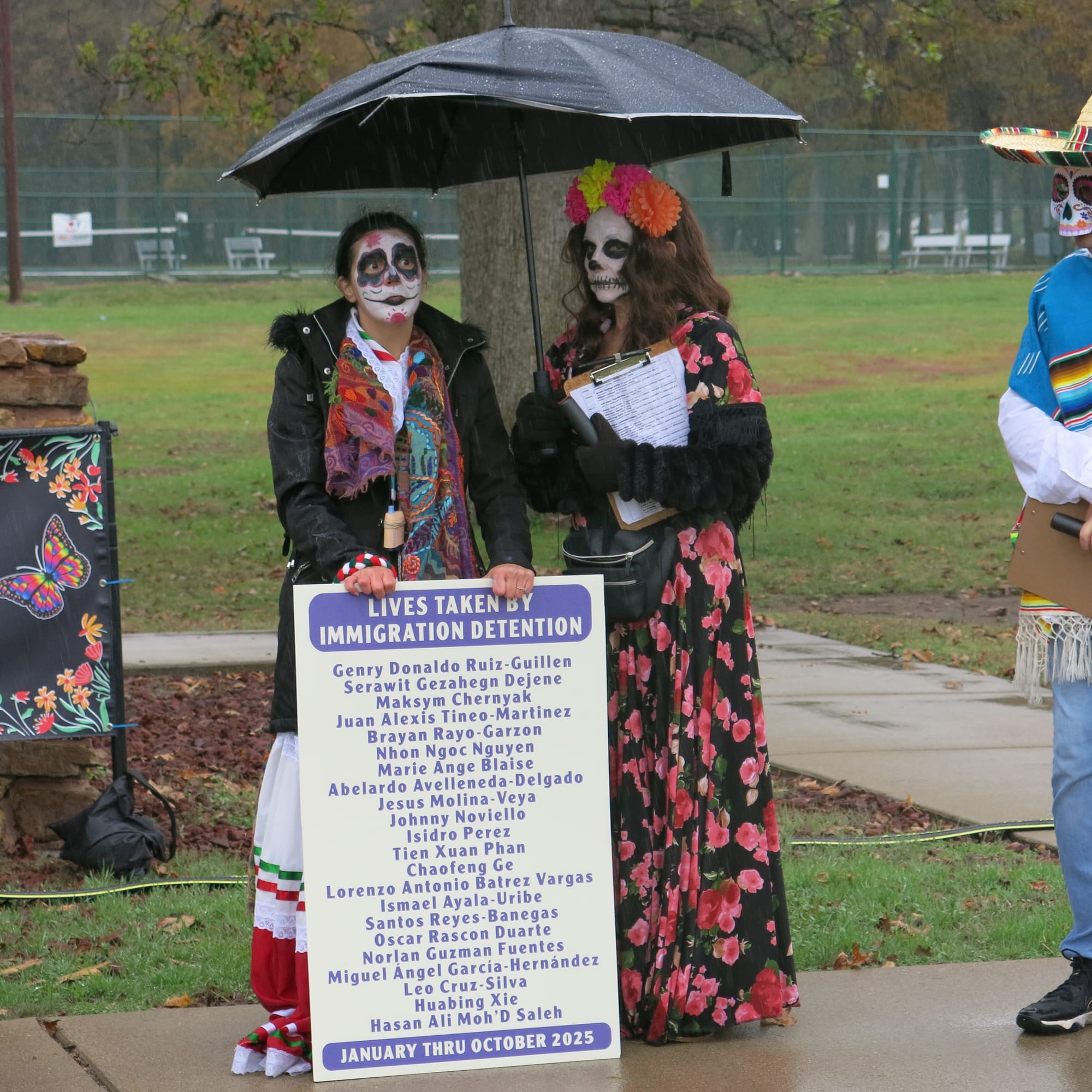 Despite the weather turning quite cold and rainy, approximately 37 participants showed up for a Day of the Dead/Dia de los Muertos event to memorialize the 22 lives that have been lost this year while in custody of ICE detention facilities across America. Stories of individuals were shared and a festival altar was created with photos and traditional items such as marigolds, sugar skulls, paper banners, and votive candles.