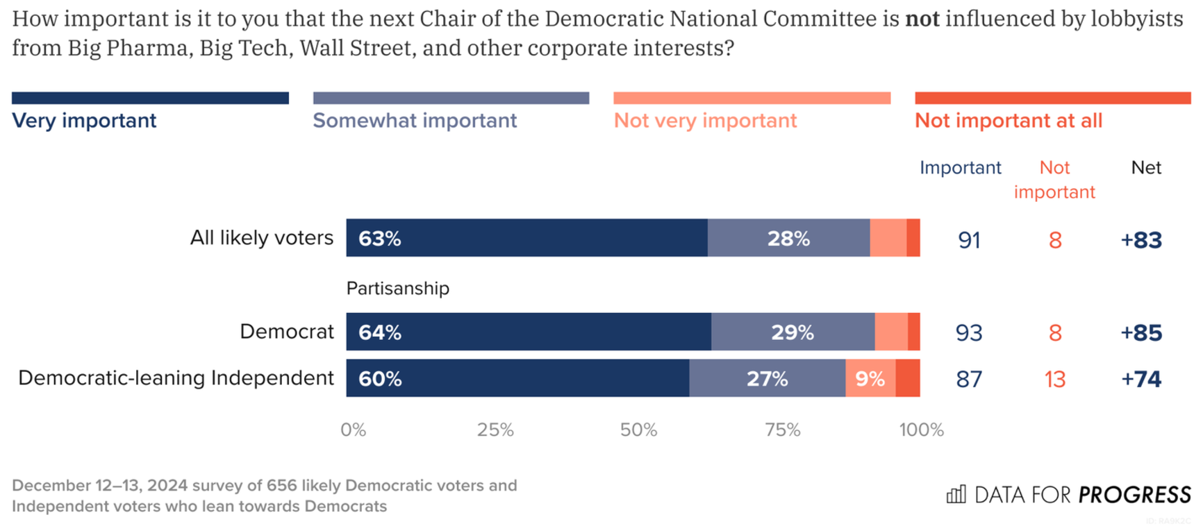 Nearly all Democrats (93%) and Democratic-leaning Independents (87%) say that it is important that lobbyists from Big Pharma, Big Tech, Wall Street, and other corporate interests do not influence the next DNC chair. Nearly two-thirds of Democrats (64%) and Democratic-leaning Independents (60%) say this is “very important.”