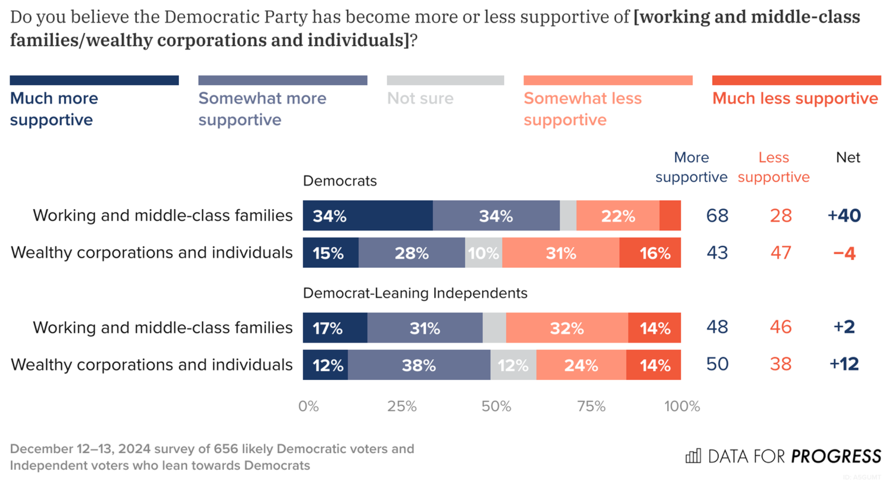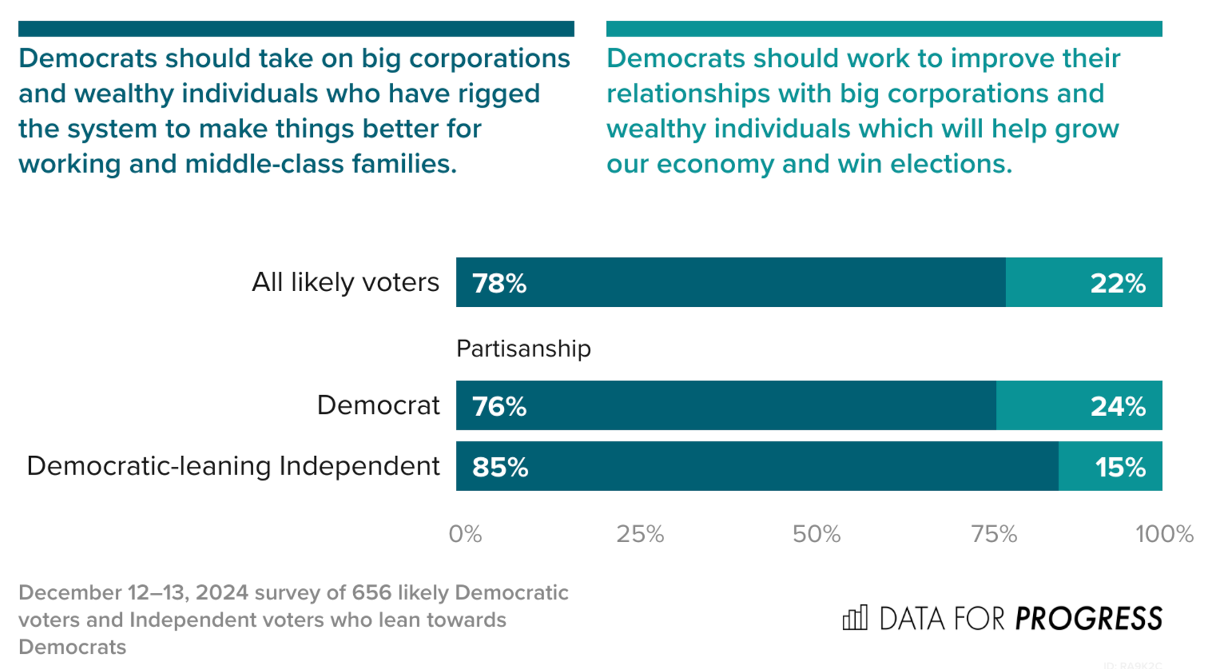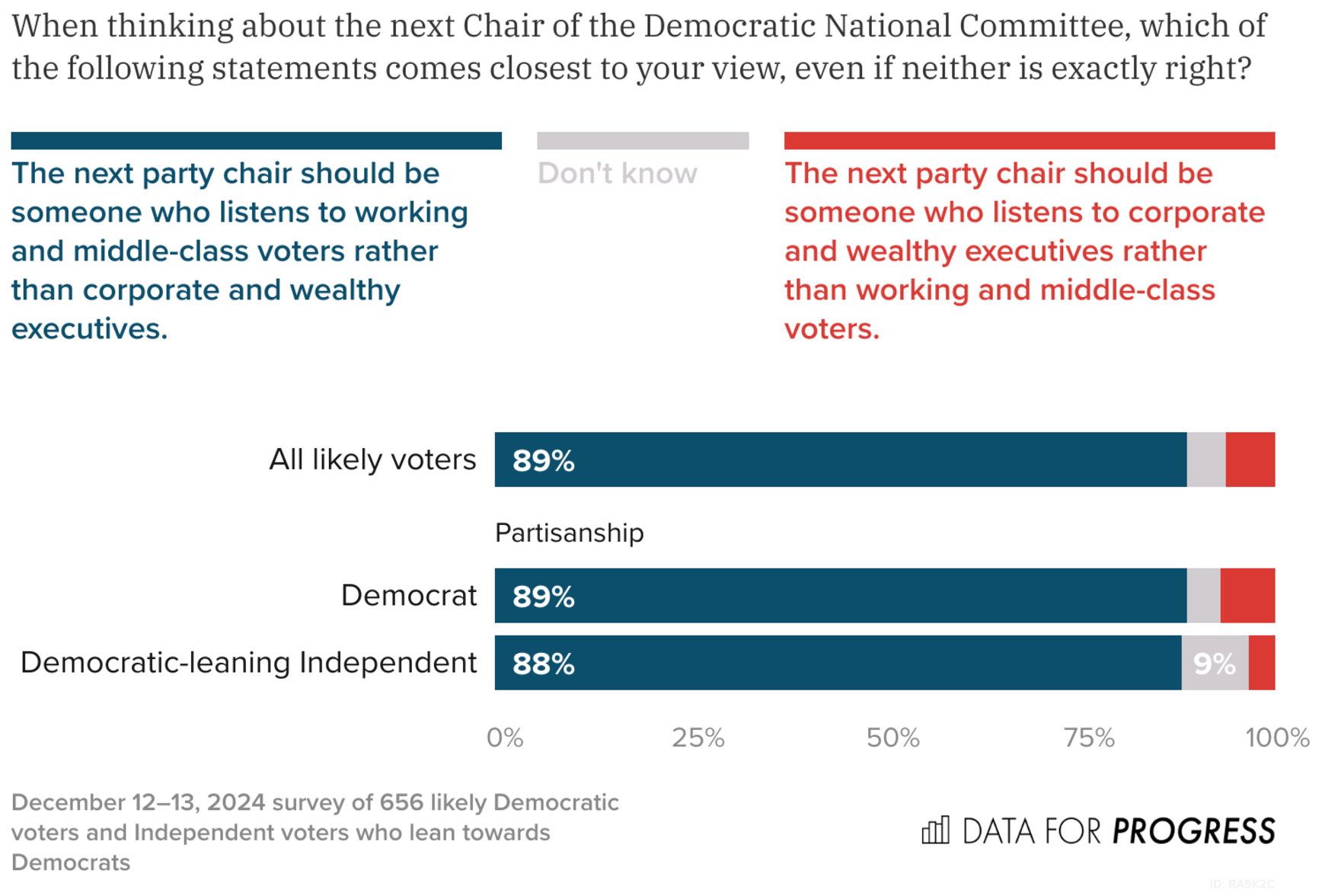 A new Data for Progress survey of likely Democratic and Democratic-leaning Independent voters, conducted December 12-13, 2024, finds that Democratic voters strongly believe the next DNC chair should not be tied to corporate interests and that they should align themselves with workers and the middle class.