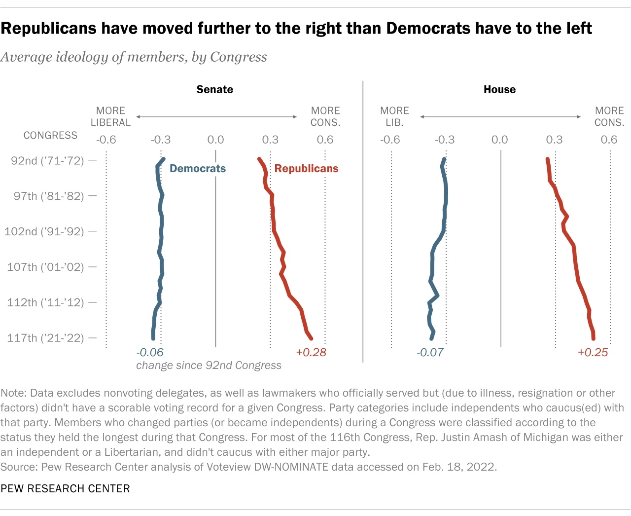 The research used members of the U.S. Congress' voting history to place them in a two-dimensional ideological space. They found that both parties had moved away from the ideological center from the 1970s, with Democrats becoming on average more liberal and Republicans "much more" conservative. Studies on the general public show similar trends. According to a Gallup poll published in January, 74% of Republicans identified themselves as "conservative," while only half of the Democrats identified themselves as "liberal."