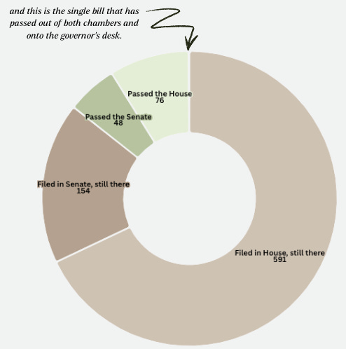 Including that one, roughly 14.5% of all bills filed thus far have cleared at least one chamber.