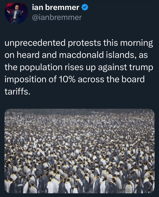 The peaceful residents of Heard and McDonald Islands held a press conference today to respond to the 10% tariff placed on the Goods and Services produced by this island of....penguins.