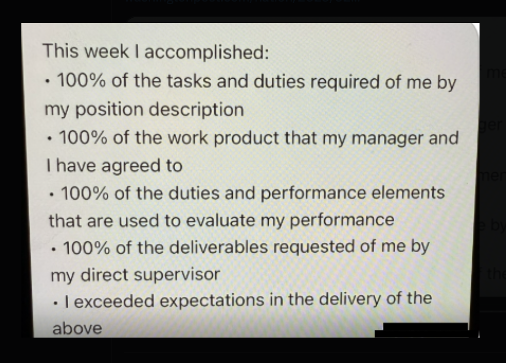 Carol Lennig on Twitter quotes Washington Post reporting on how the Secret Service instructed its agents to comply with Elon Musk’s directive to send him “the five things you accomplished this week, or be fired.”