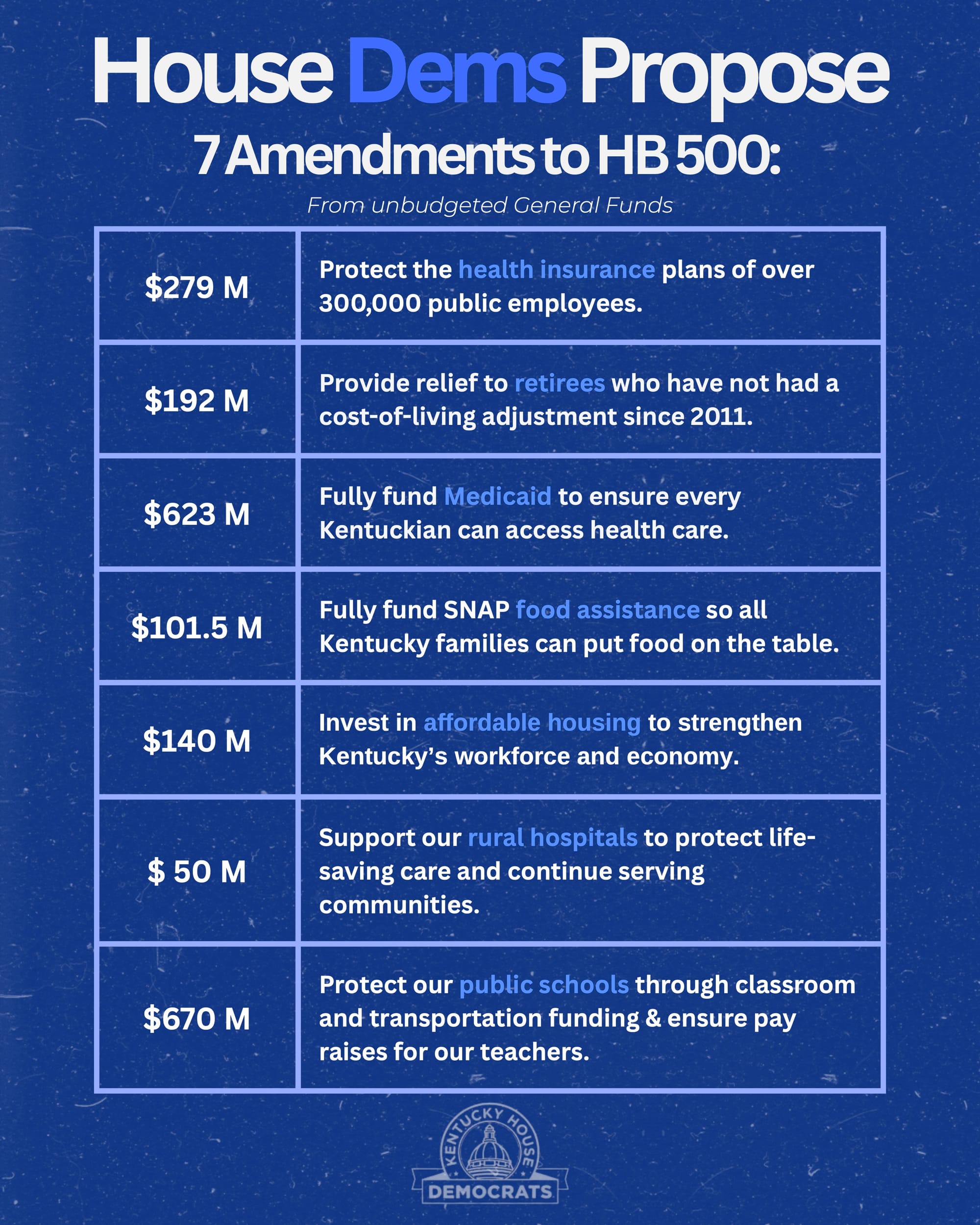 The Democratic package focuses on stabilizing health insurance for public employees and retirees, protecting Medicaid funding, feeding hungry Kentuckians, investing in affordable housing, supporting rural hospitals, and strengthening public education.
