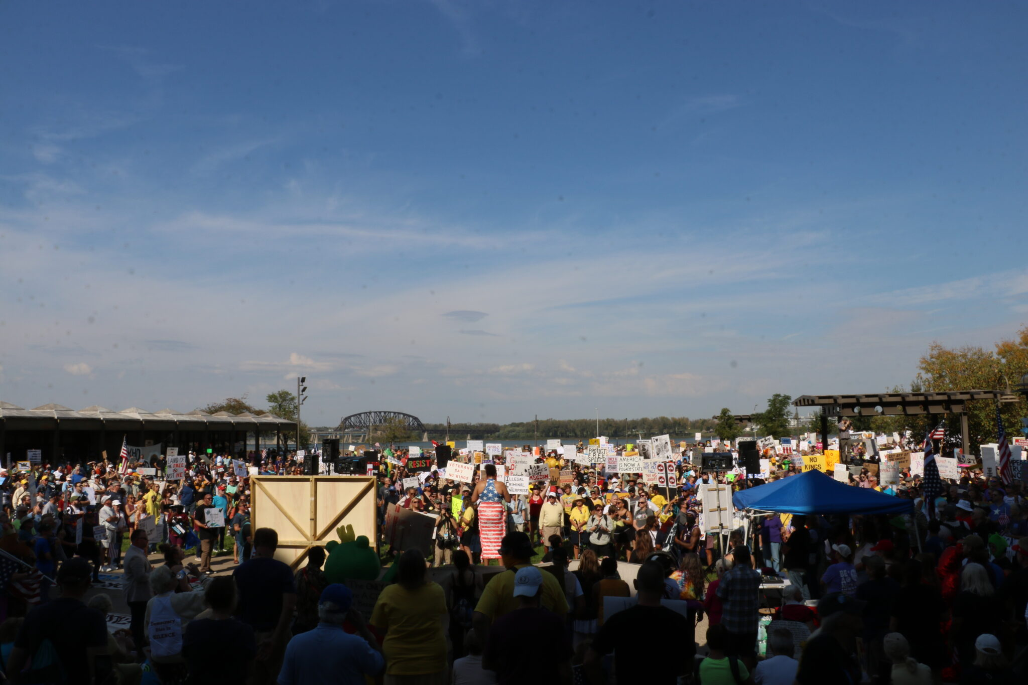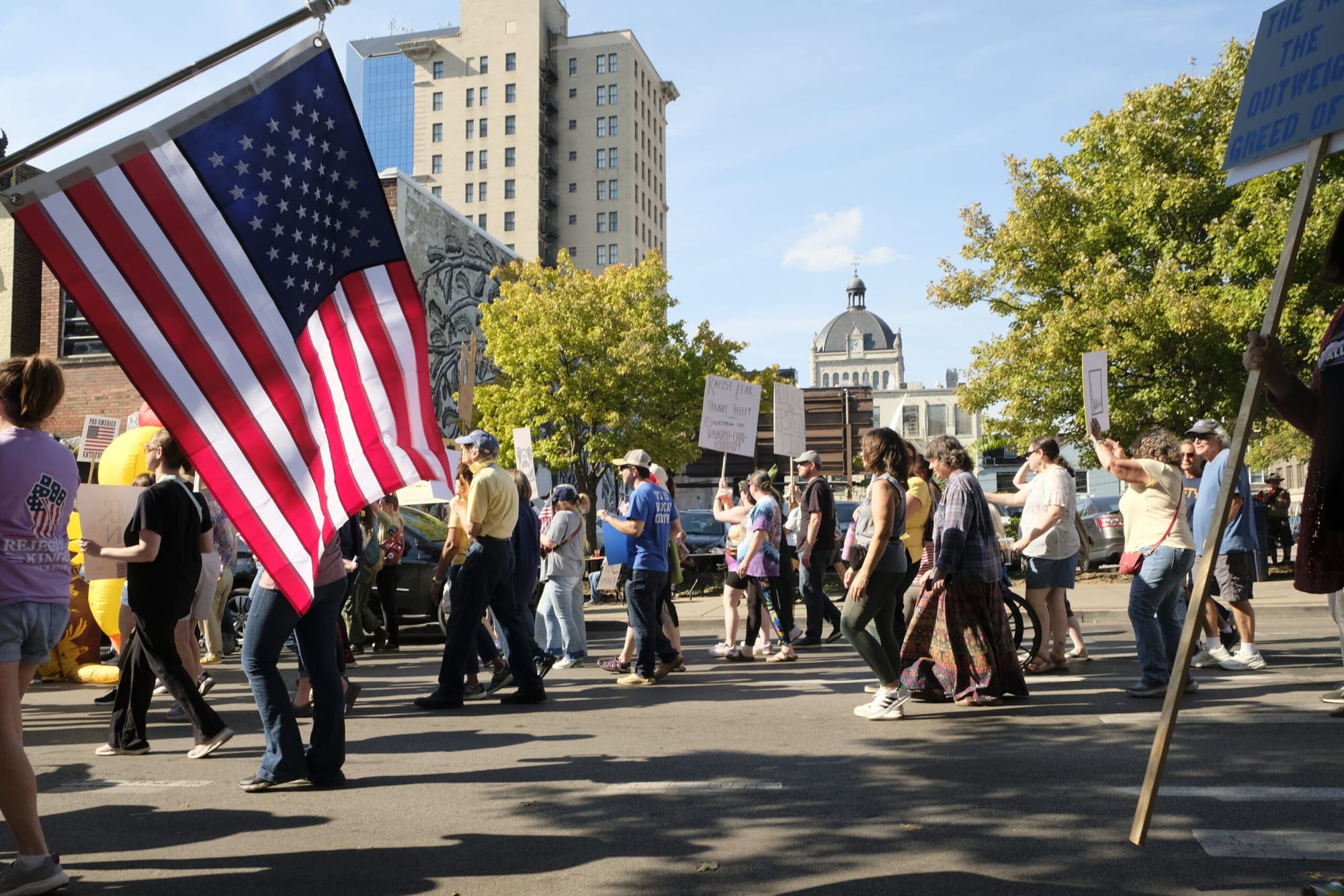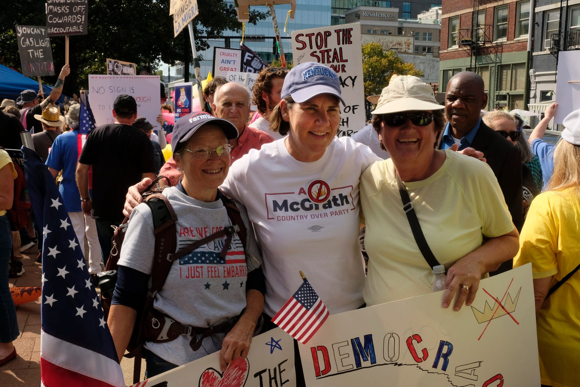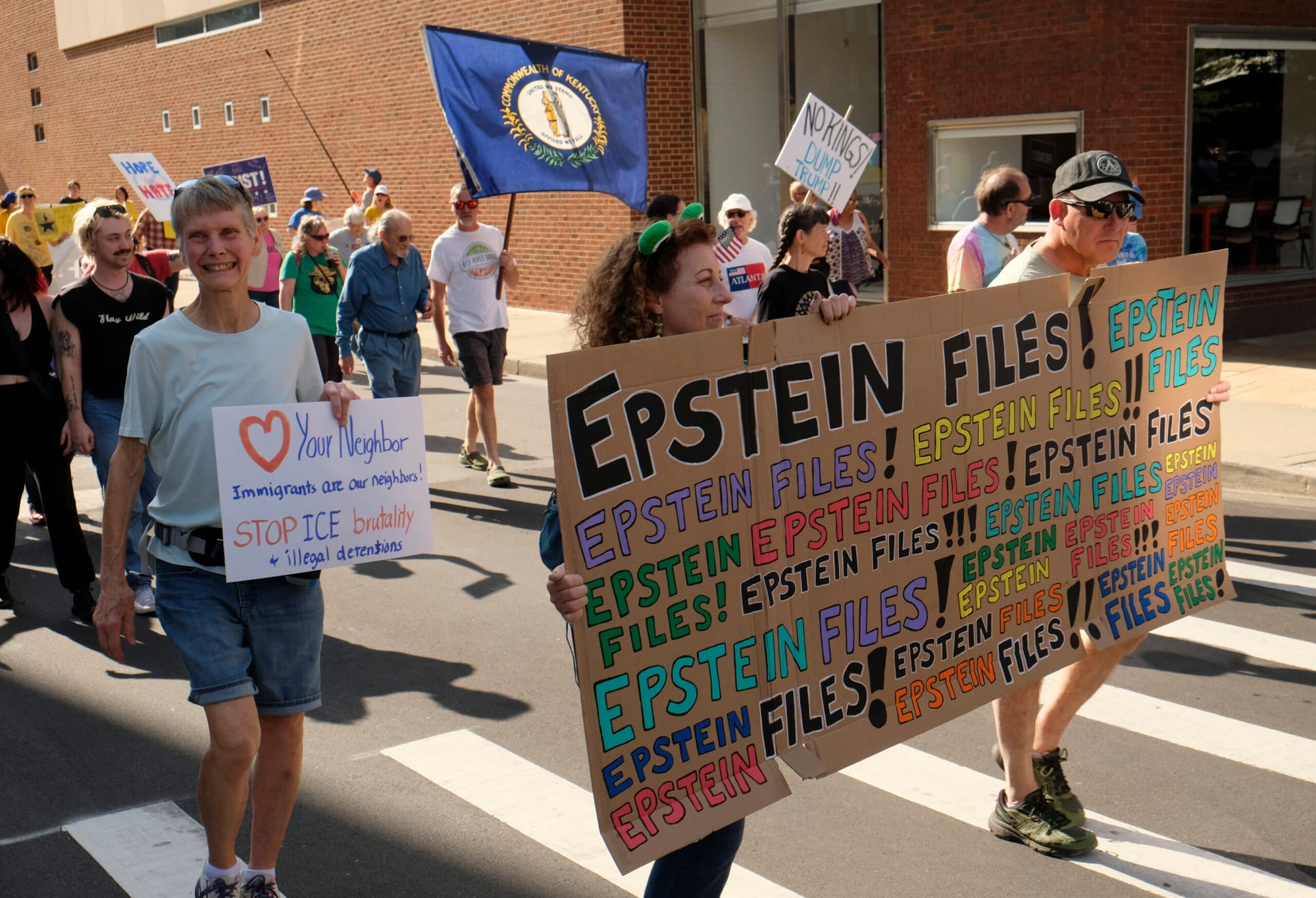 Thousands of Kentuckians turned out under the autumn sun to protest President Donald Trump’s administration, some pointedly refuting Republican claims disparaging their motives.