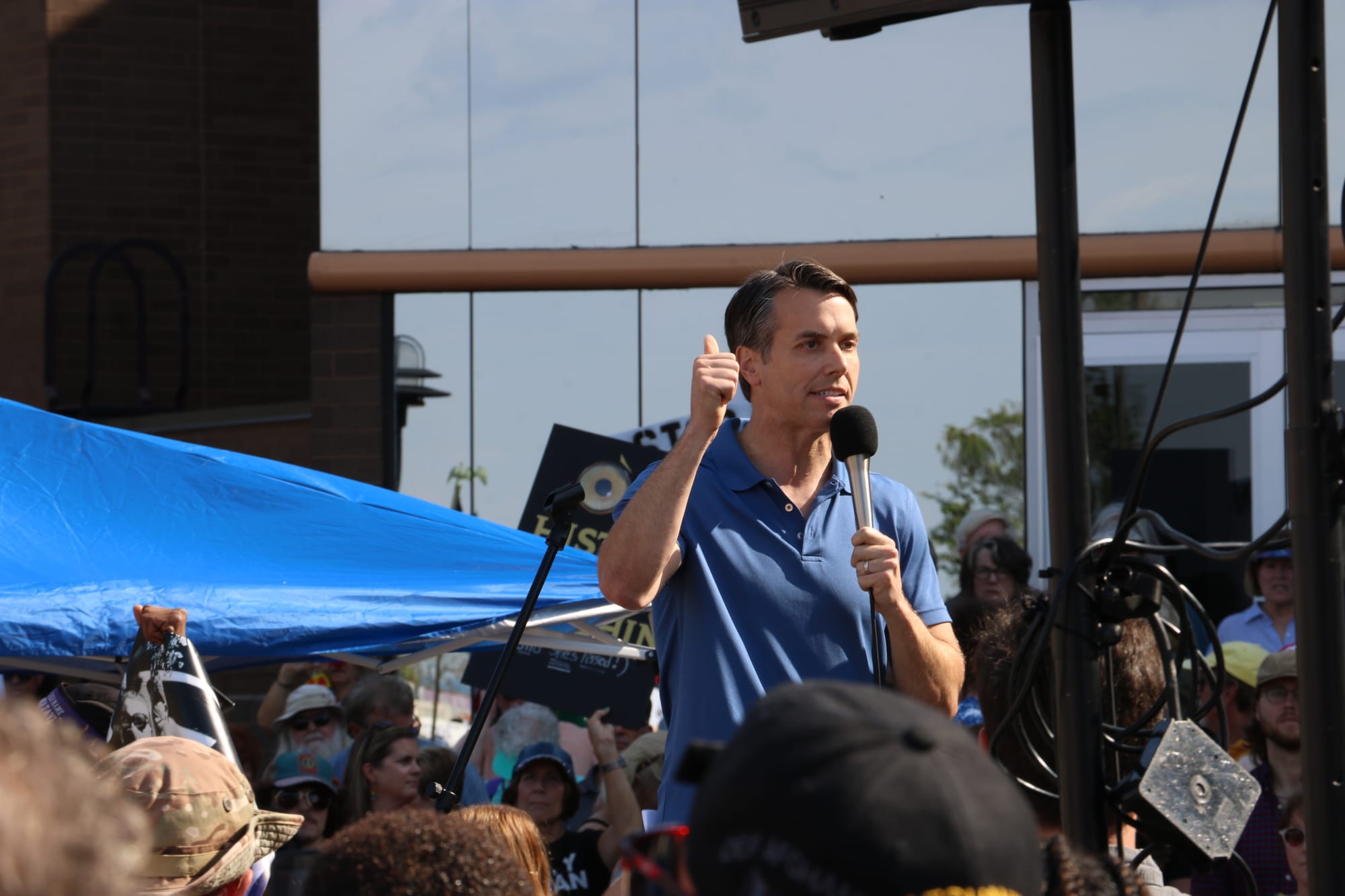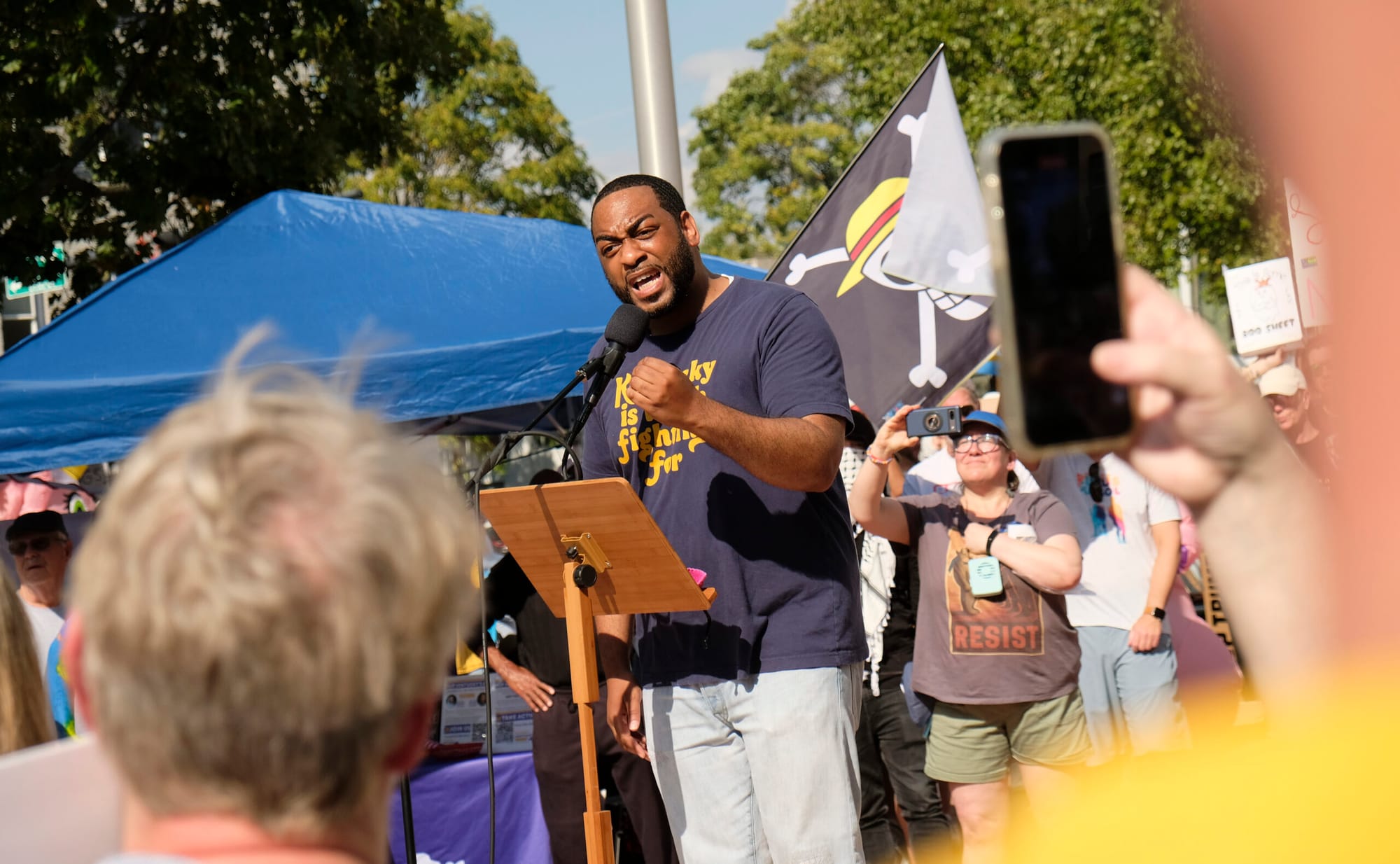 John “Drew” Williams, a Democratic candidate challenging Republican U.S. Rep. James Comer in Kentucky’s 1st Congressional District, said the Frankfort rally was his second of the day after another event in Danville. Williams, who is from far West Kentucky, said it was important for him to be in Frankfort because of the town’s importance to the state and because Franklin County was added to the 1st Congressional District during redistricting. In Comer’s district, a thin line of counties along Kentucky’s southern border connects the state’s far western tip and the Mississippi River with Franklin and Boyle counties in Central Kentucky.