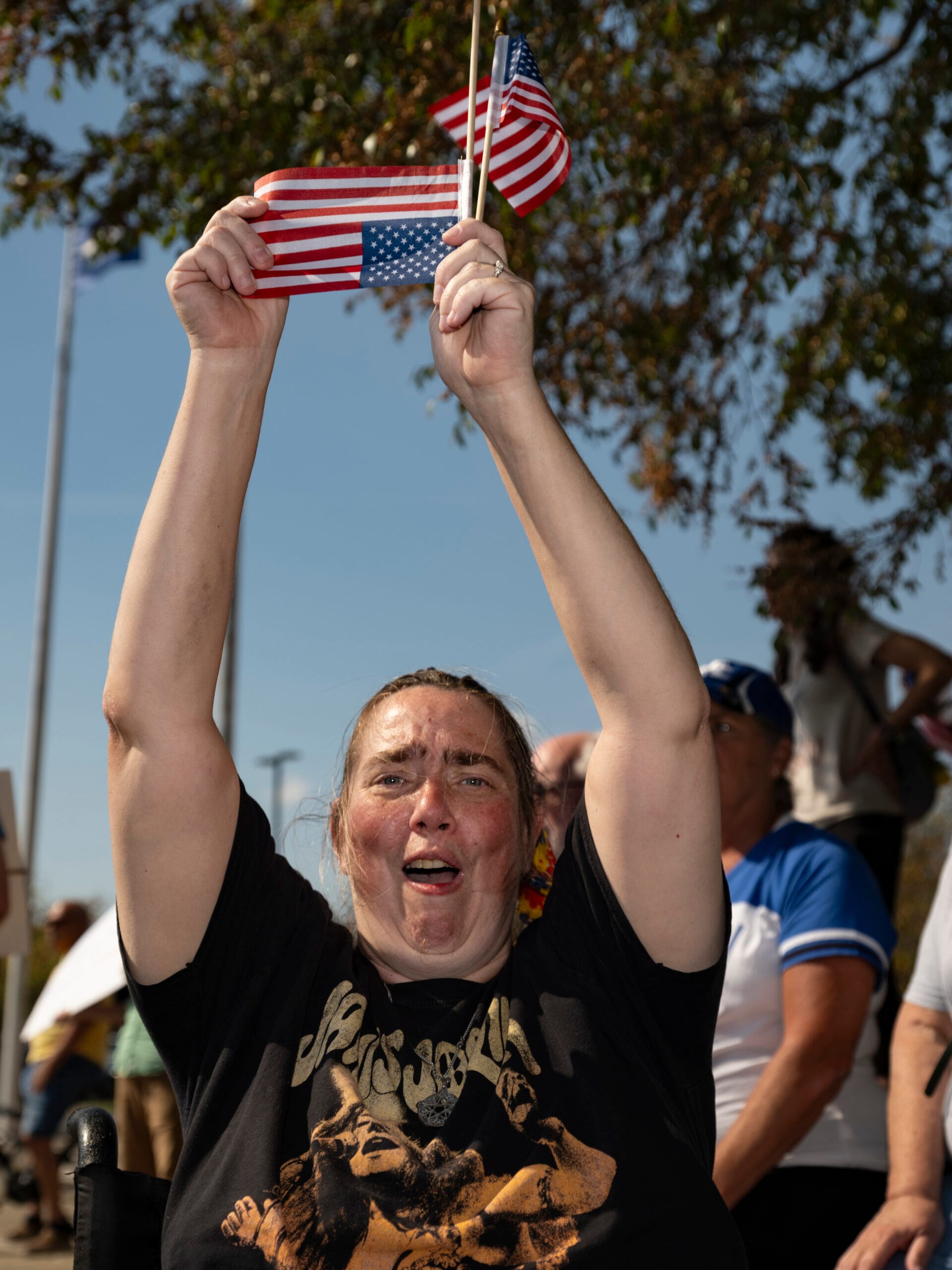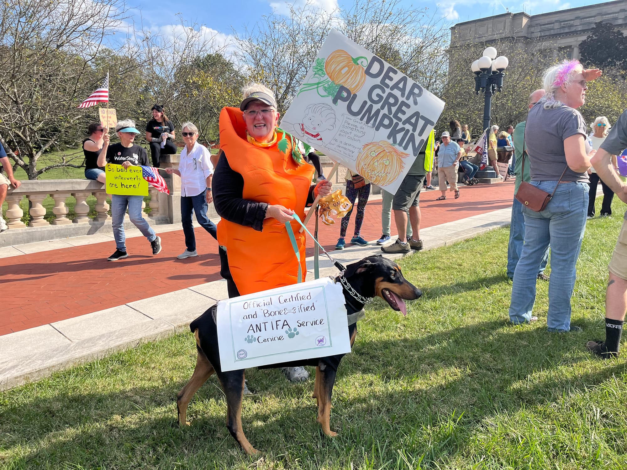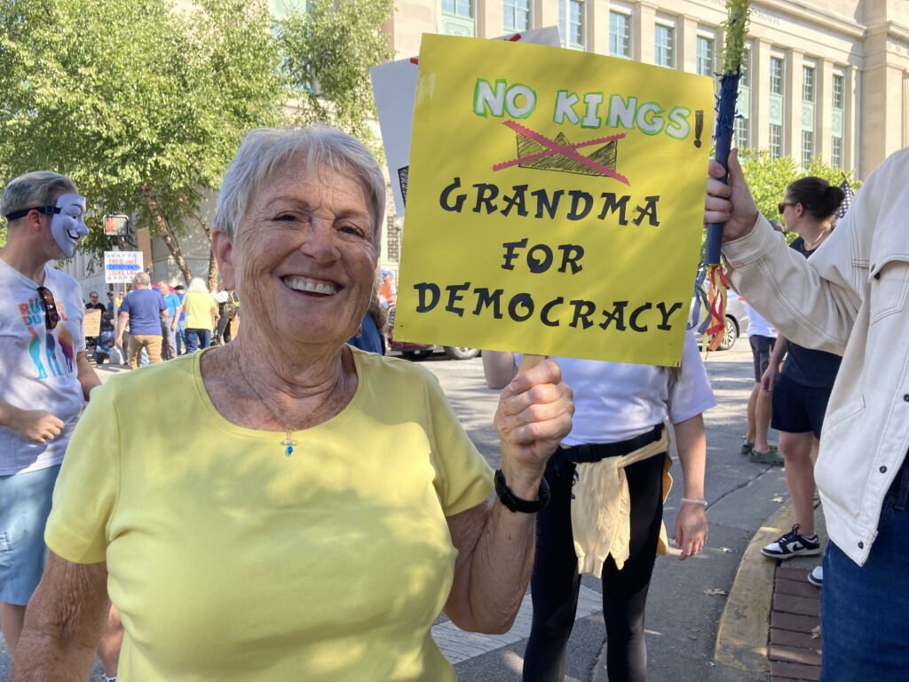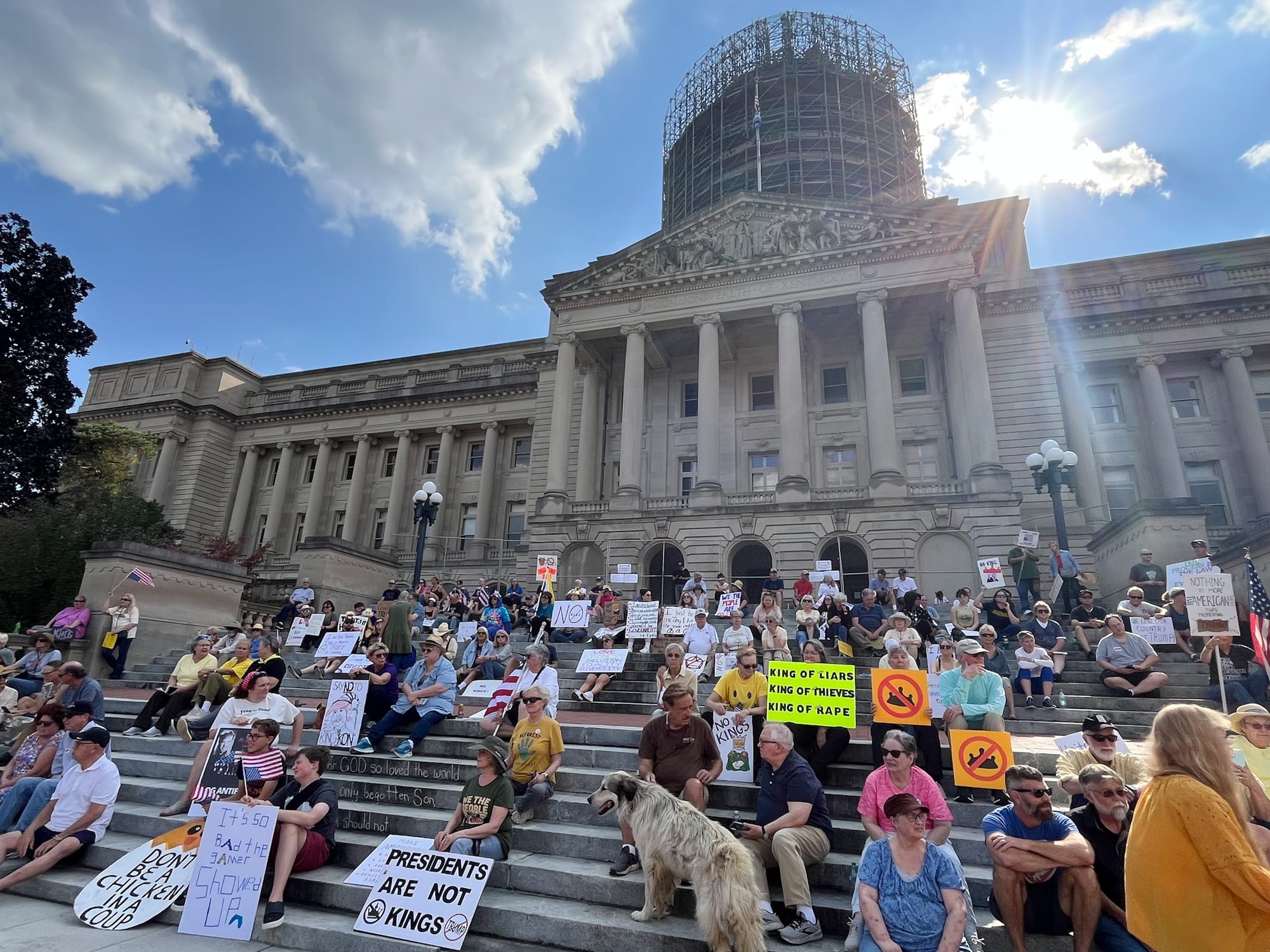 - Woodford County resident Alyssa Cumming and her dog, Cody, came to the No Kings rally at the Kentucky State Capitol to stand up for her friends and family who are immigrants. She raised concerns about the direction of the country, adding that “we’re not moving any closer to greatness right now.”