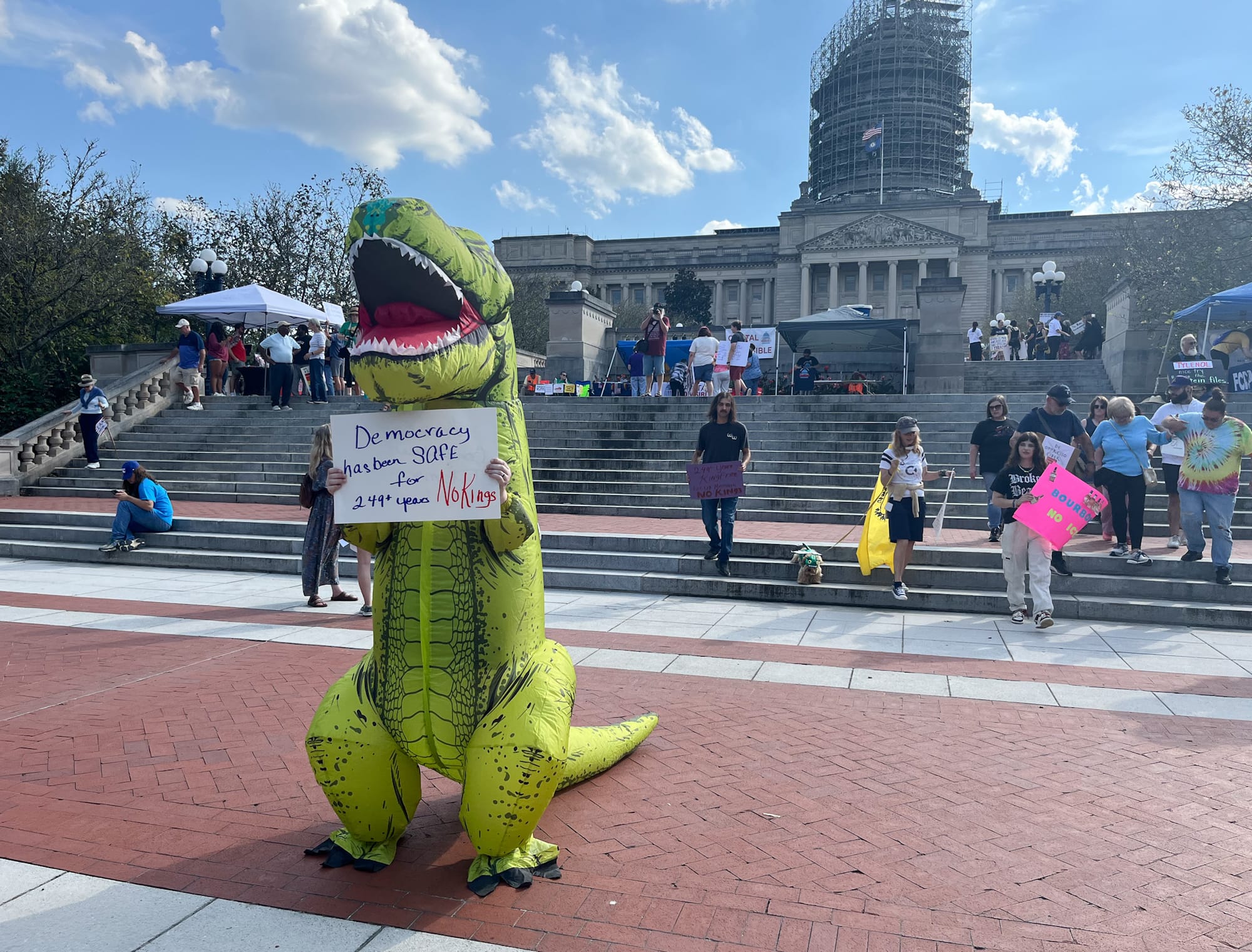 - A Kentucky resident who did not wish to give their name dances in a dinosaur costume outside the State Capitol. They said the costume shows solidarity with Portland but also get more attention for the No Kings movement. A Portland protestor recently sparked a trend of dressing in a costume for a protest.