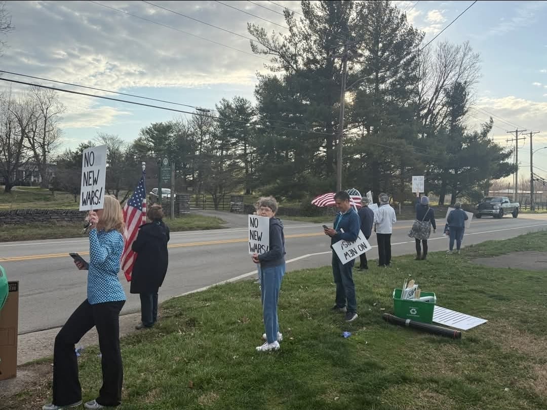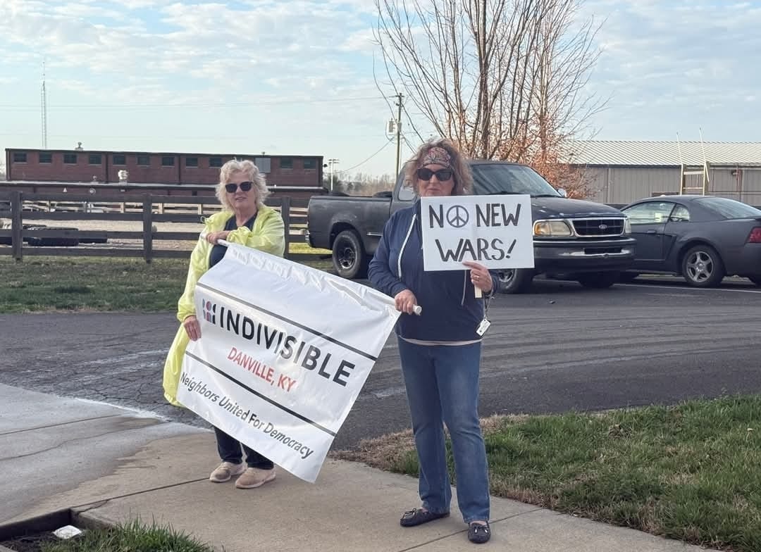 The annual Boyle County Republican breakfast, featuring Ky’s US Sen. Rand Paul and Rep. Andy Barr, gave Indivisible Danville an opportunity for a “pop-up” demonstration against President Donald Trump’s anti-constitutional actions in attacking Iran, what many consider to be the beginning of war without congressional authorization.