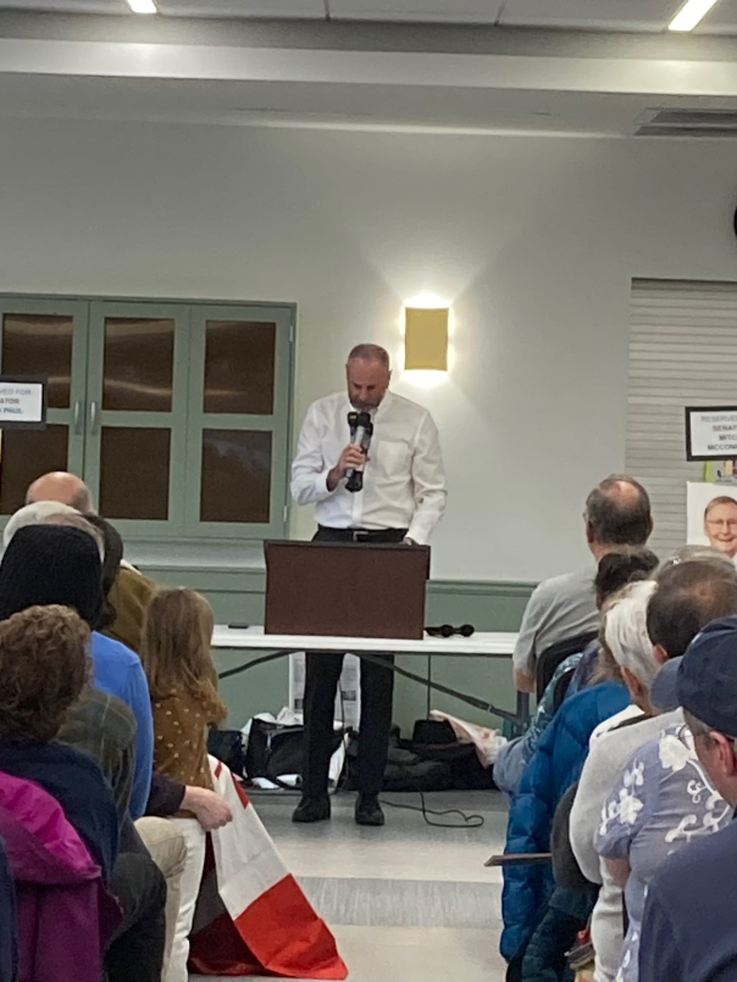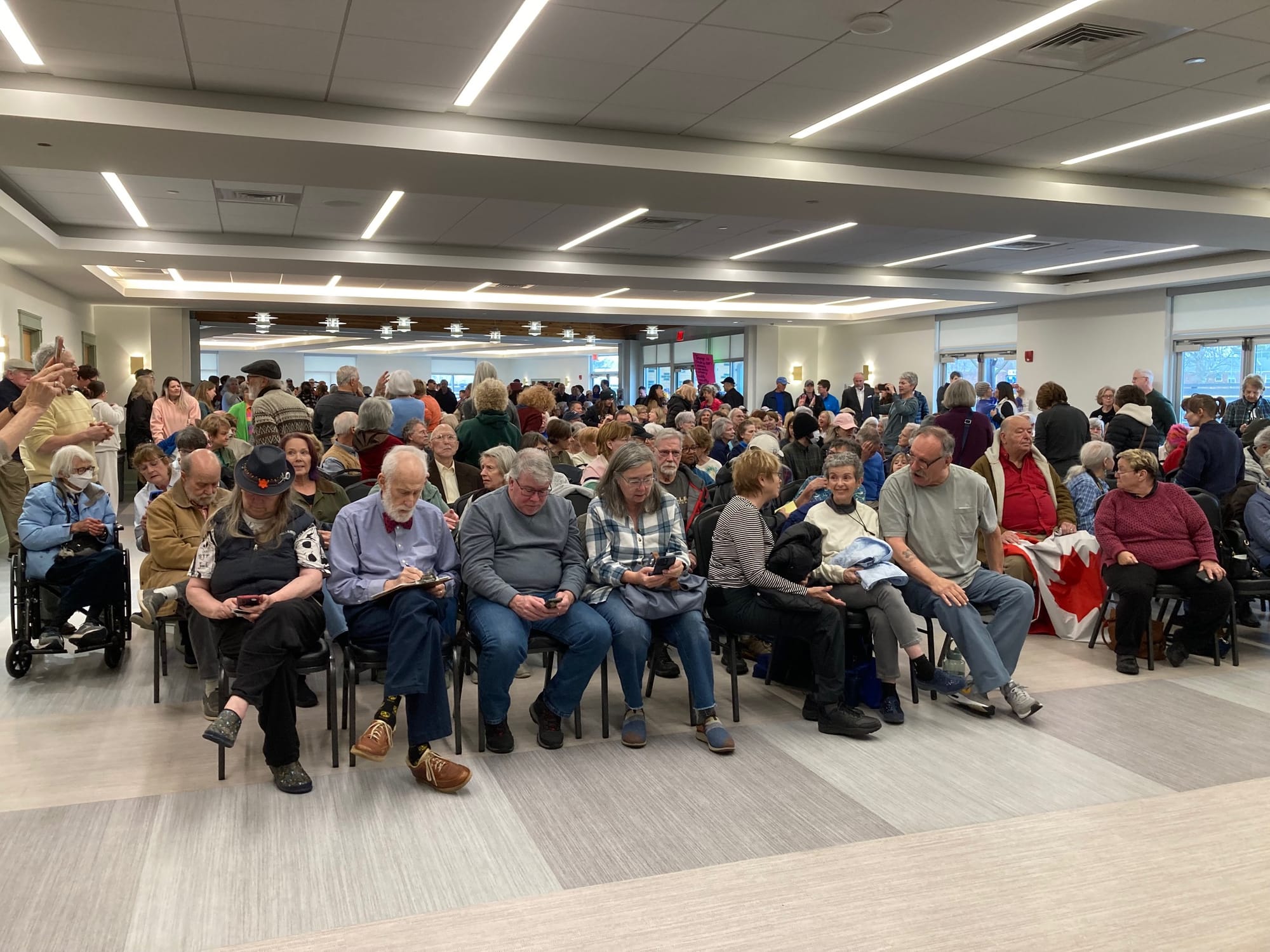 Approximately 600 people participated in a “mock” town hall meeting at the Arterburn (the St. Matthews Community Center) on Sunday, March 16. The Louisville Chapter of Indivisible invited Kentucky Senators Rand Paul and Mitch McConnell to the meeting, but received no responses. In their absence, citizens addressed their questions to two empty chairs and pictures of the Senators posted on separate tables at the front of the room for about 25 minutes.