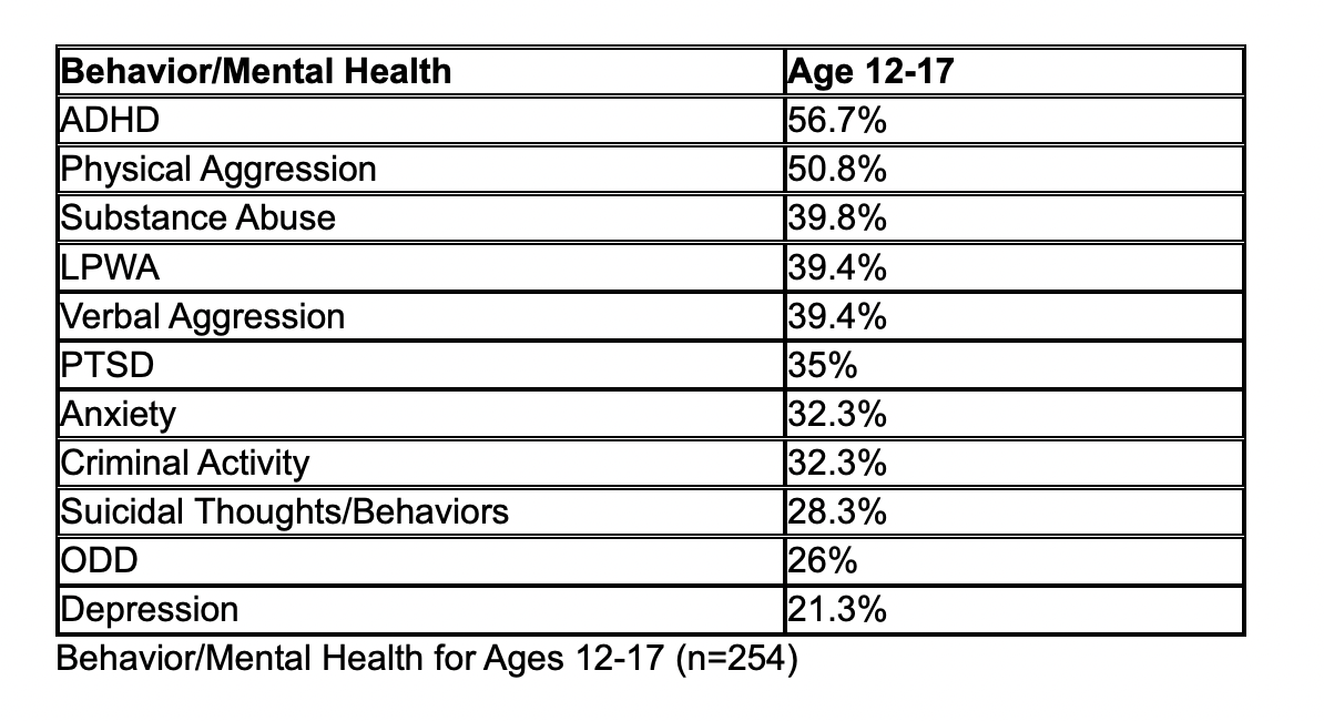 According to the ombudsman’s report, it’s mostly males who end up in nontraditional placements. Many have mental health conditions requiring care including attention deficit hyperactivity disorder (ADHD), physical aggression, substance abuse, verbal aggression, post traumatic stress disorder (PTSD), anxiety, criminal activity, suicidality, depression, Oppositional Defiant Disorder and incidents of leaving placement without authorization.