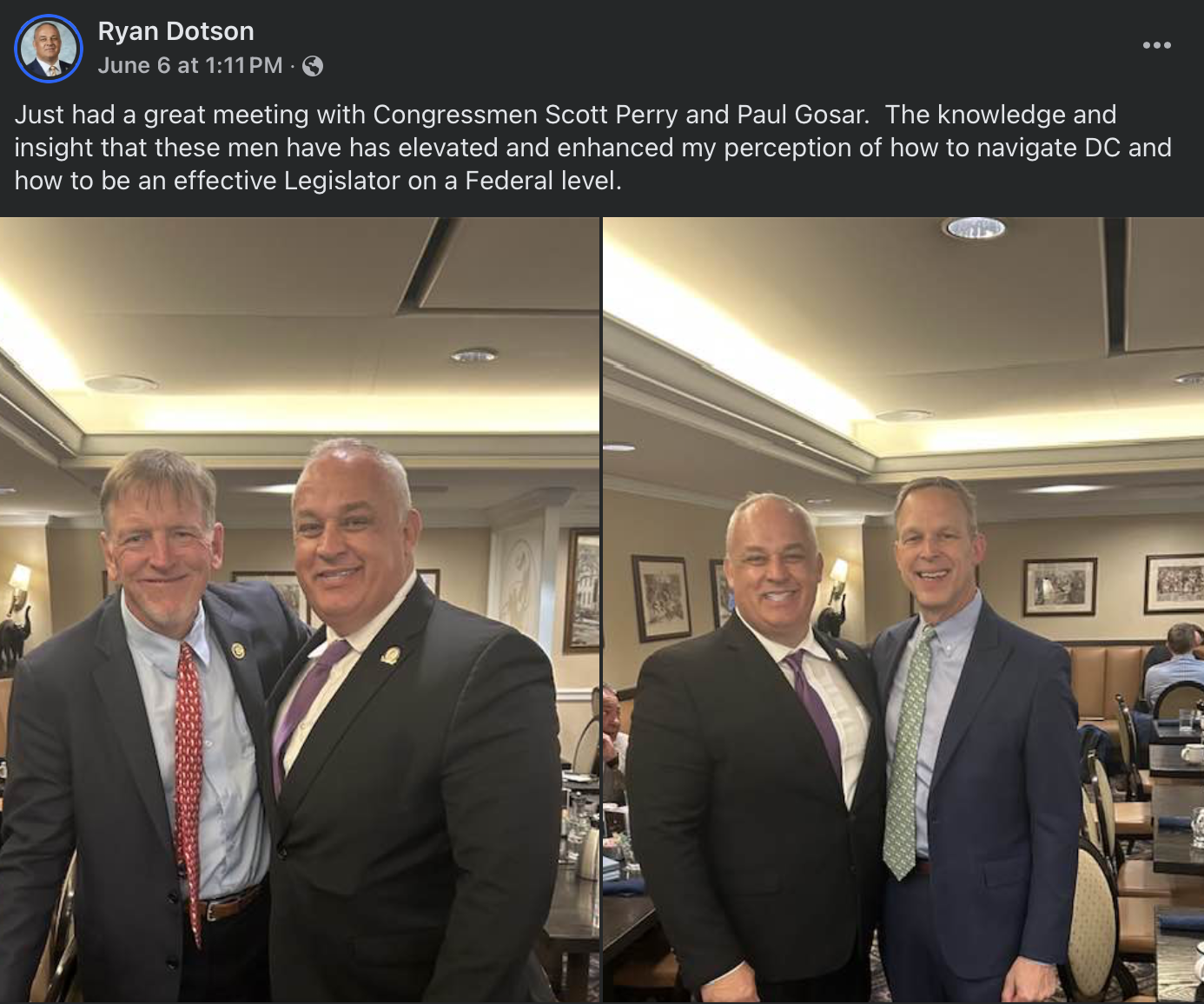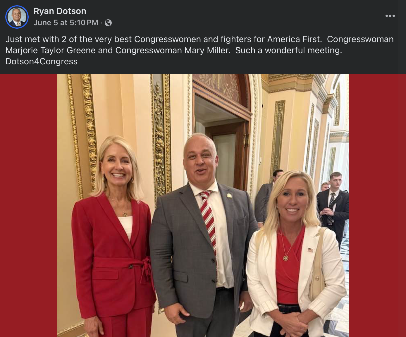 All these photos came from Ryan Dotson’s Facebook page. There’s no photoshopping, no AI manipulation. Just a set of photos in his own name, showing the elected officials he looks up to and wants to emulate.