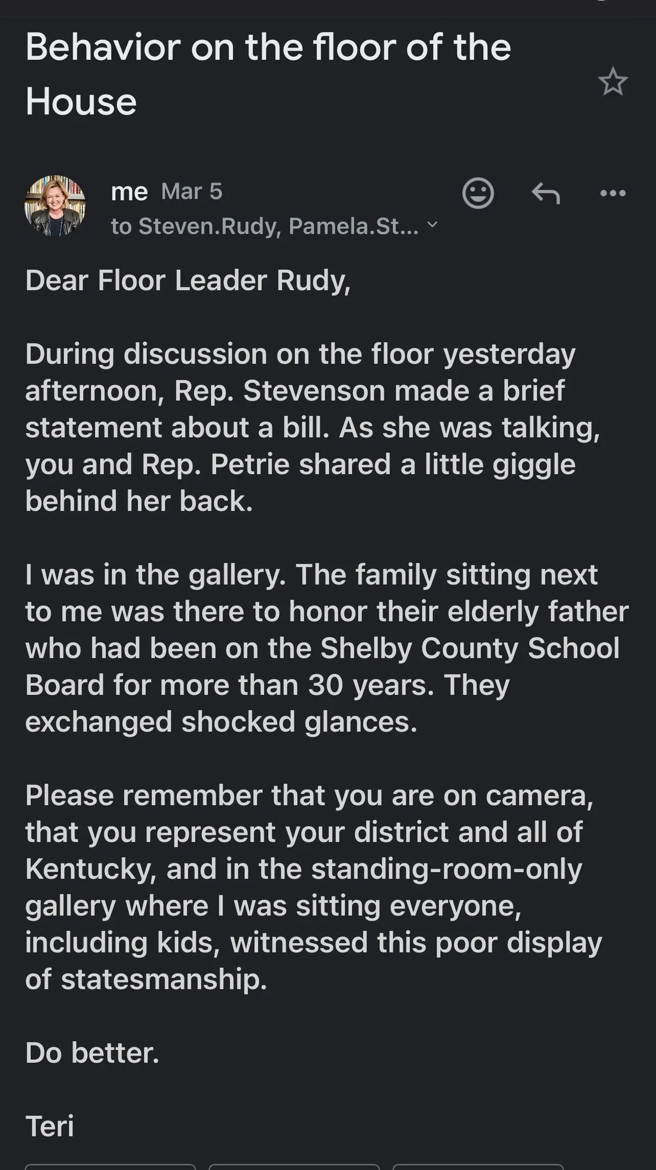 On March 4, during this year’s Kentucky General Assembly, I grabbed a front row seat in the House gallery to watch floor debates. The next morning I emailed GOP Floor Leader Steven Rudy and cc’d representatives Jason Petrie, Pamela Stevenson, James Tipton and House Speaker David Osborne.