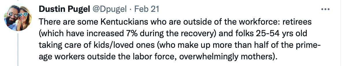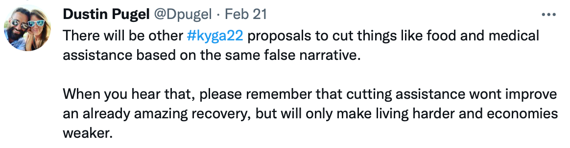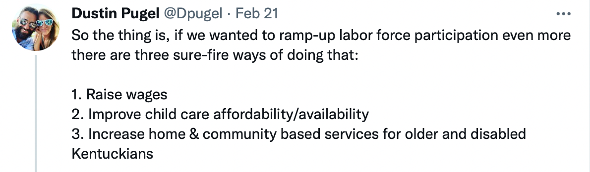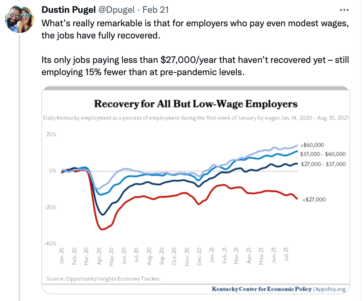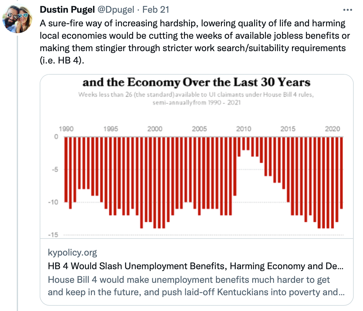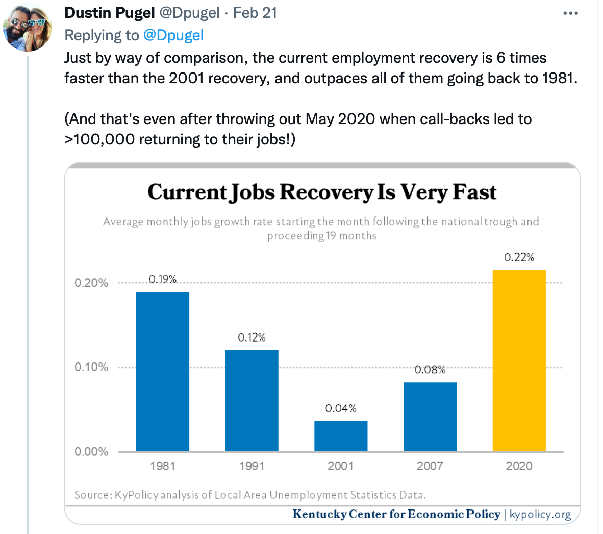 Dustin Pugel is a Senior Policy Analyst with the KY Center for Economic Policy. On February he posted a Twitter thread about the claims of some that the economic recovery in Kentucky is slow, so we need to cut the safety net. As he pointed out, not only is that not true, but it is actually counter-productive.
