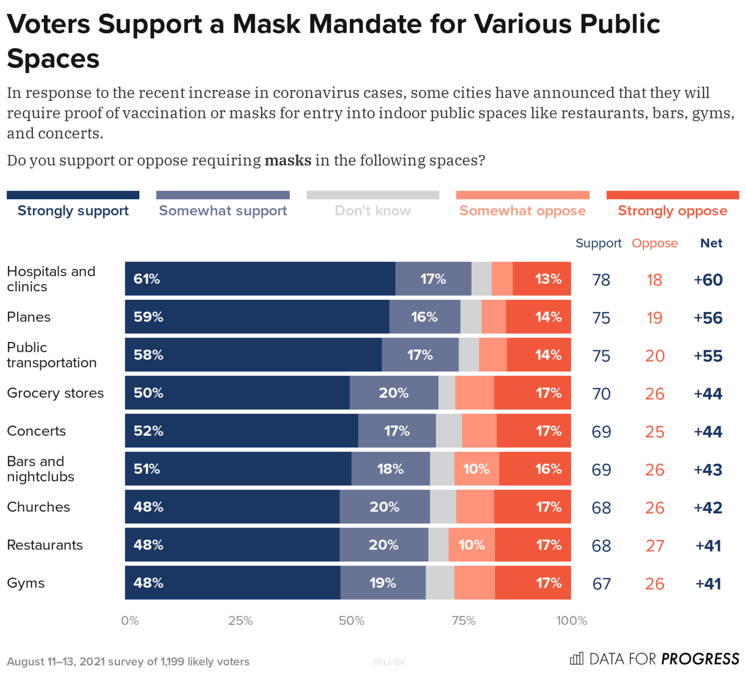 Republican voters support mask mandates in hospitals and clinics by a +36-point margin, on planes by a +26-point margin, on public transit by a +21-point margin, in grocery stores by a +2-point margin, at concerts by a +7-point margin, at bars and nightclubs by a +5-point margin, and at churches by a +1-point margin. Republicans are split evenly regarding mask mandates for restaurants, and support requiring masks at gyms by a +2-point margin.