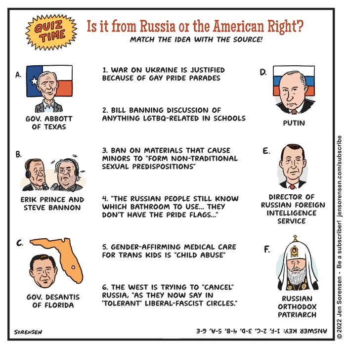 Okay, class, today we have a current events quiz from Jen Sorensen. Which of these quotes came from someone in Russia, and which ones came from someone on the American Right? Got your pencils? Ready, set, go!