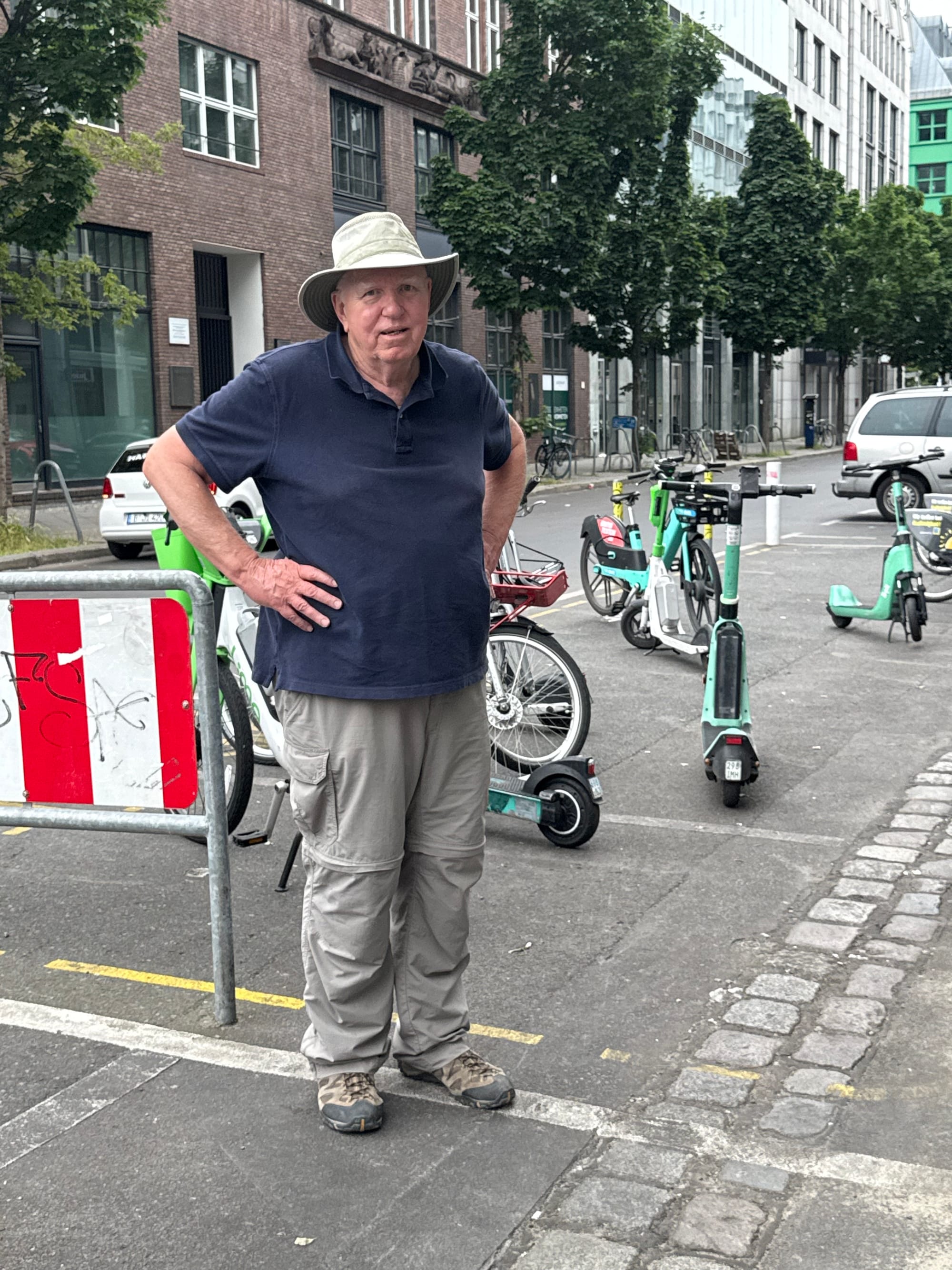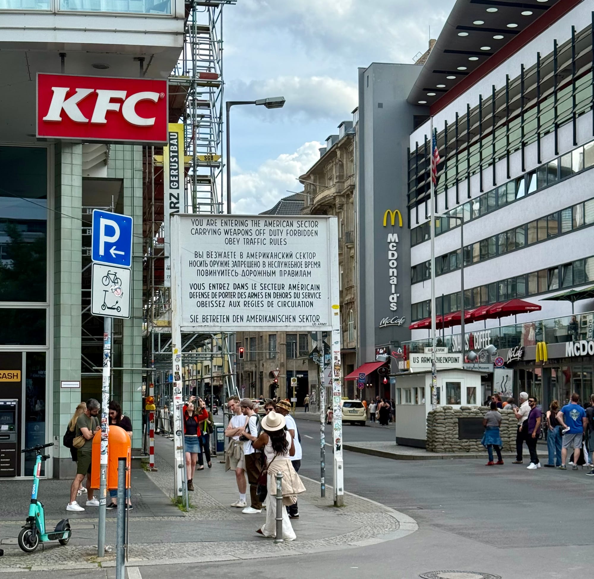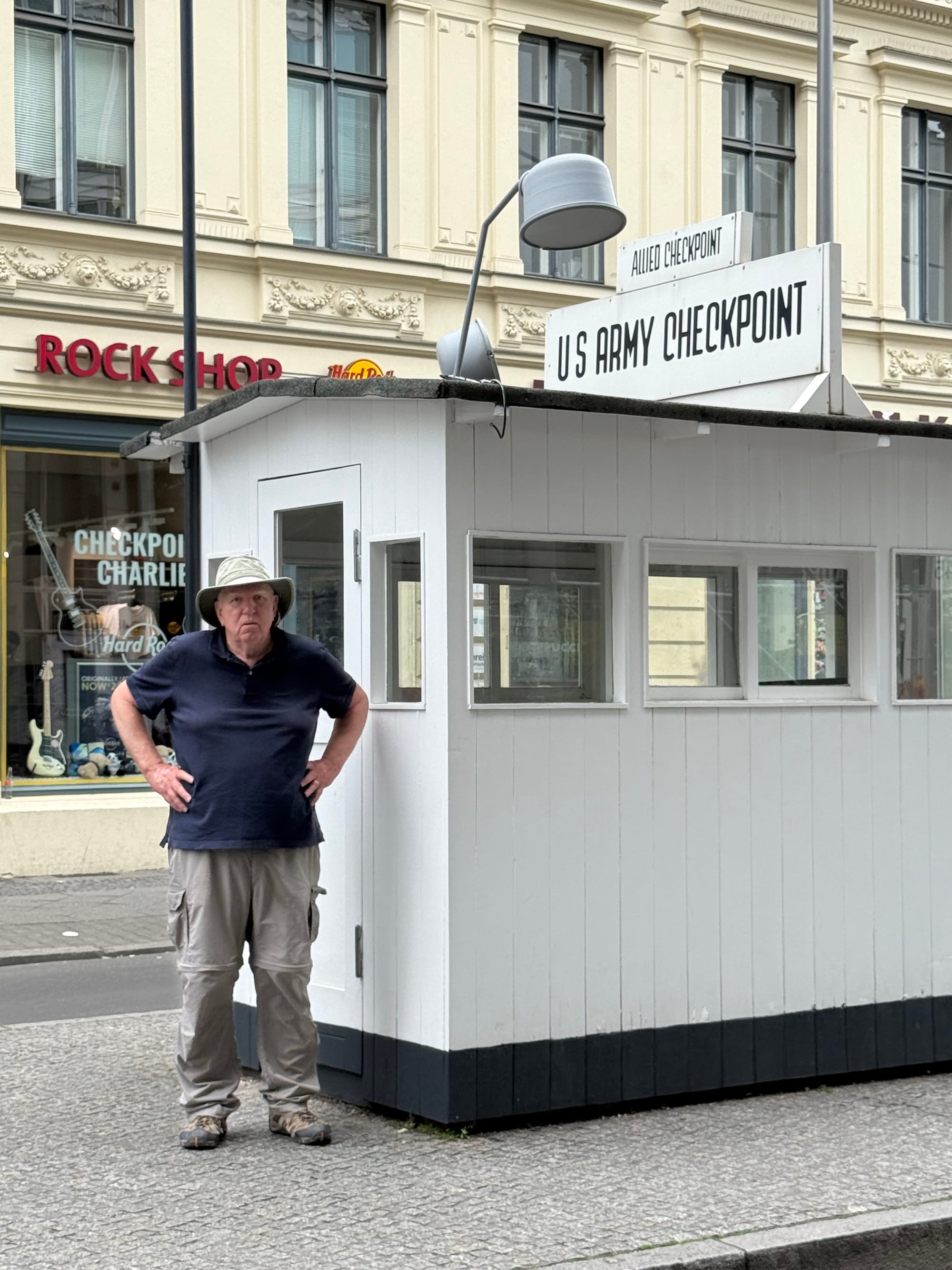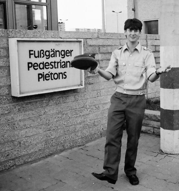 At the location of Checkpoint Charlie; a sign left from the time of the wall and the divided city; Berry standing where the wall and Checkpoint Charlie once stood.