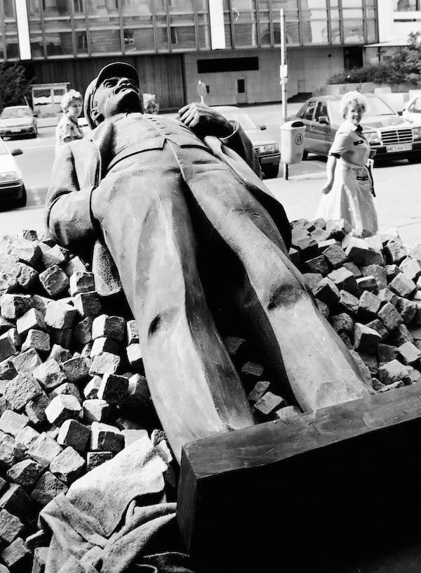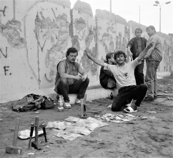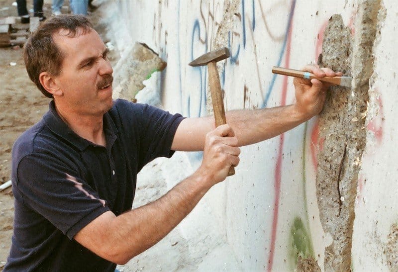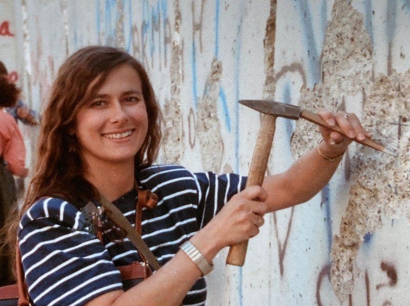 On this spot 35 years ago this month, Melinda and I did our bit to hammer down the Berlin Wall. The stones set in the pavement mark where the wall stood at Checkpoint Charlie, the iconic east-west portal in what the East German government called “The Anti-Fascist Protective Rampart.” West Berliners dubbed it “Die Mauer” – The Wall.
