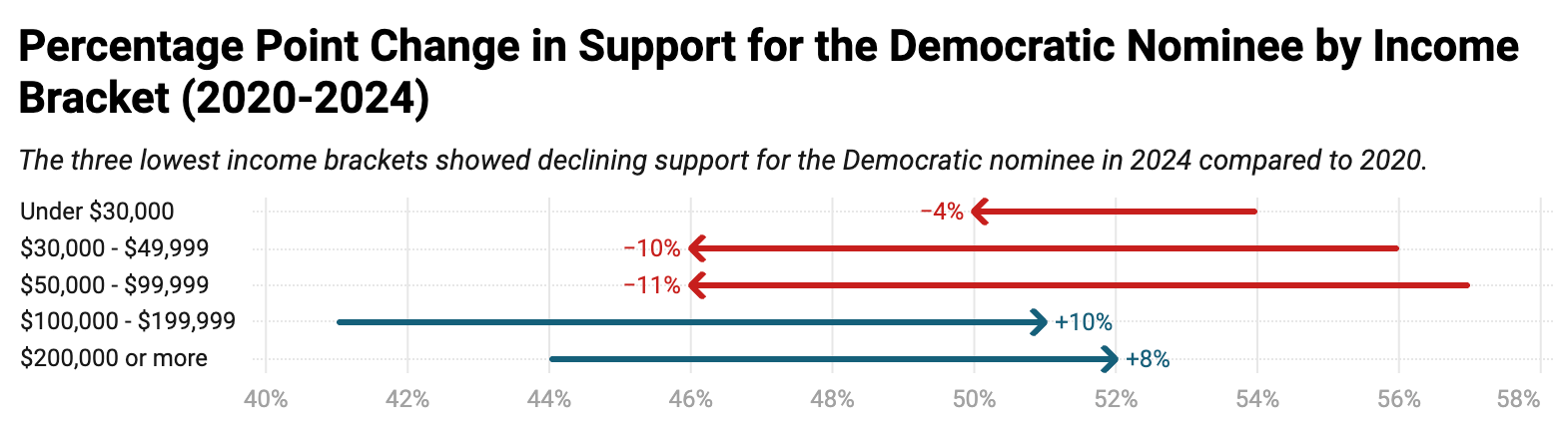The most startling trend of the election was not about rurality but income. For the first time in decades, voters with household incomes under $100,000 ditched the Democrat party for President Trump.