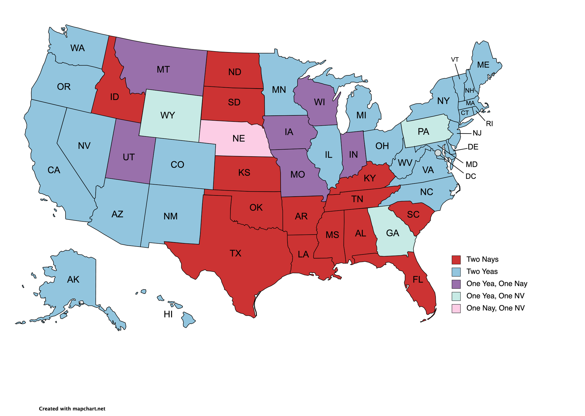 Here is a map showing how the two senators from each state voted. To see the votes by state, go here.