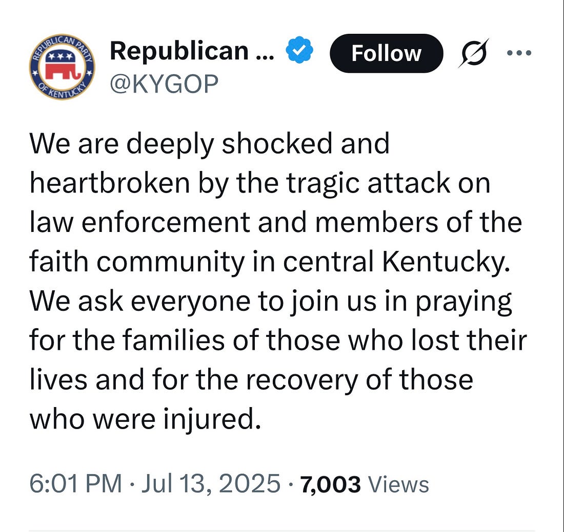 Two years later, hours after the shooting of a state trooper and a shooting in a church, the Republican Party of Kentucky posted the following on their X account.