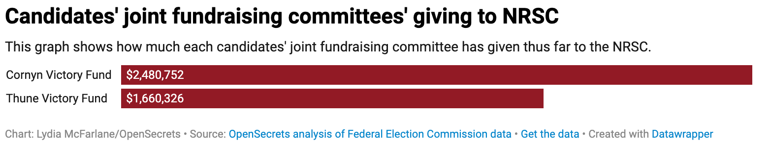 Both candidates have joint fundraising committees that have given more than $1 million to the NRSC this cycle. The Cornyn Victory Fund has given about $2.5 million to the NRSC thus far this election cycle, while the Thune Victory Fund has given $1.7 million.