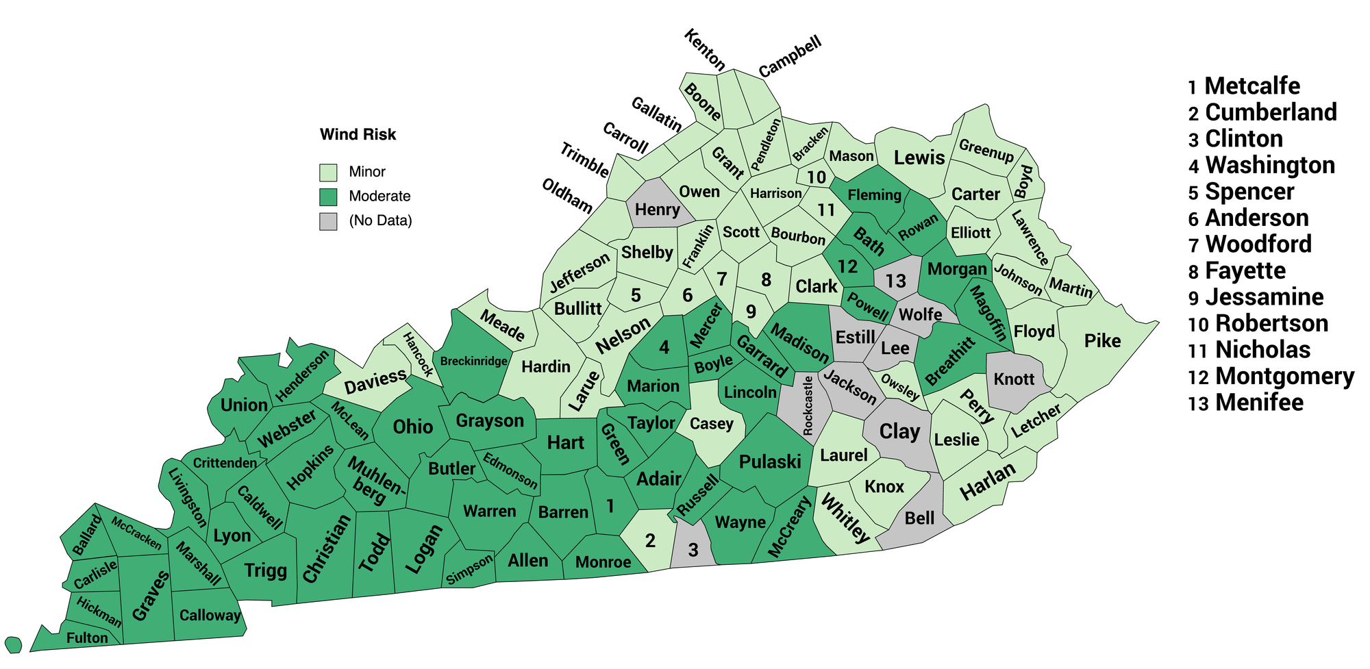 According to the Wind Risk Model from the First Street Foundation, all the counties in Kentucky are at either a Minor level of risk from wind, or at a Moderate level. Most of the ones at the Moderate level are in the central and western parts of the state.