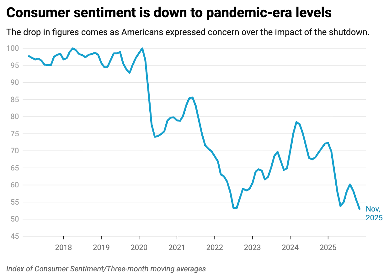 In fact, the University of Michigan’s monthly index on consumer sentiment tumbled to a near record low in November – a level not seen since the depth of the pandemic. Because lower consumer sentiment is related to reduced spending, that has a short-term impact on retailers, too.