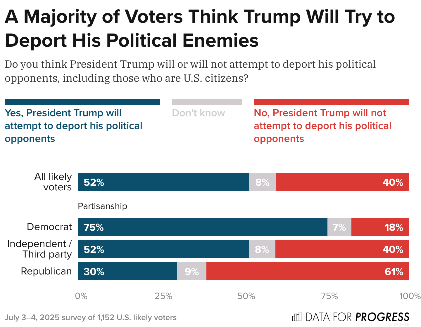 By a 12-point margin, a majority of voters believe that Trump will attempt to deport his political enemies, including those who are U.S. citizens. This includes a majority of Democrats (75%) and Independents (52%).