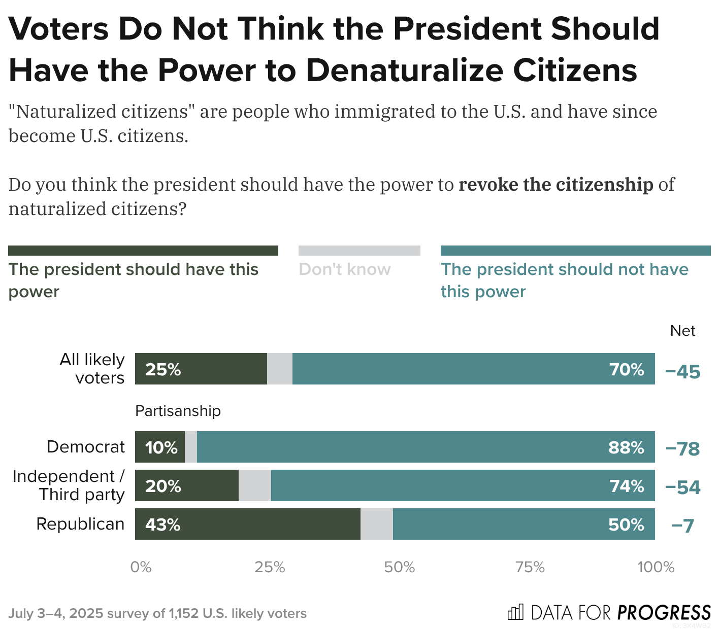 When asked whether the president should have the authority to revoke the citizenship of naturalized citizens, 70% of voters, including a majority of Independents and half of Republicans, say that the president should not have this power.