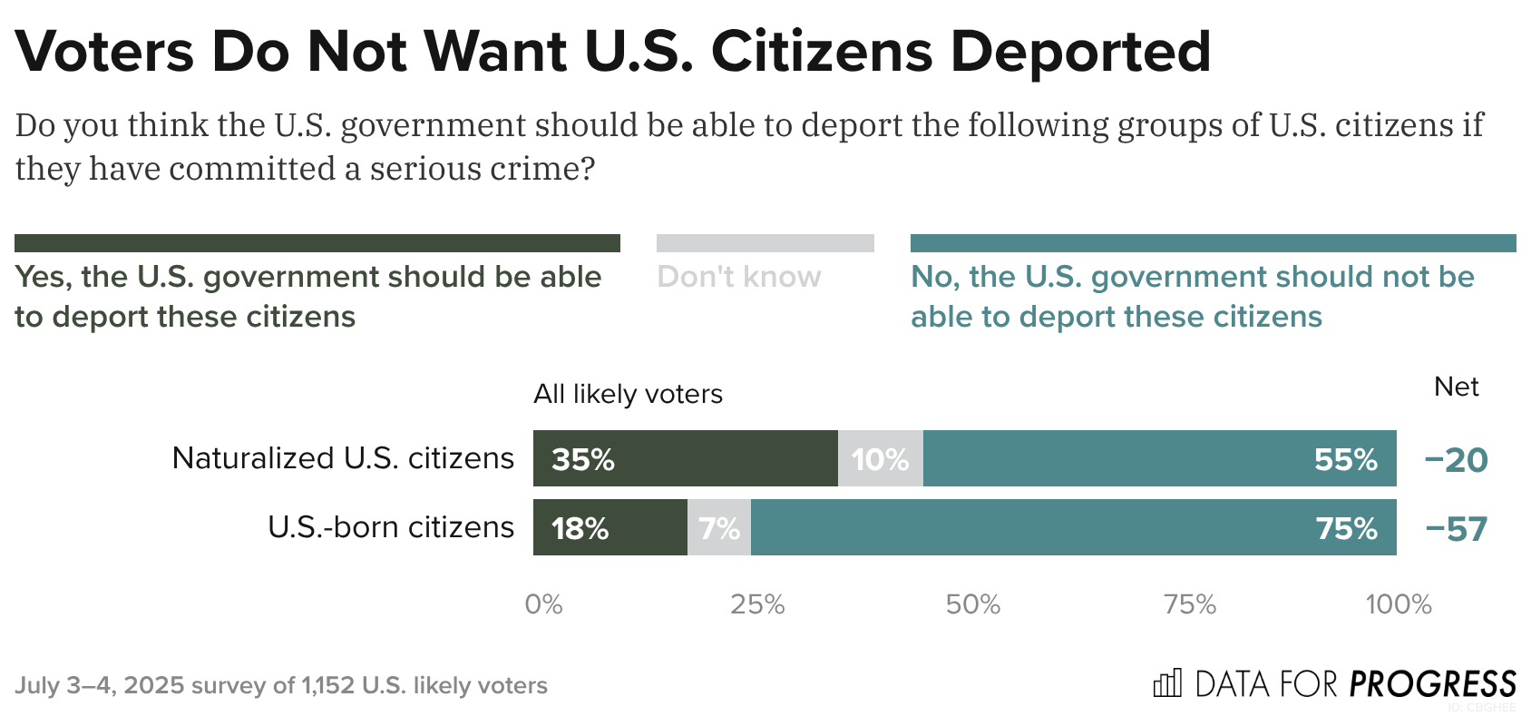 Overall, voters do not want U.S. citizens to be deported, even if they have committed a serious crime. Voters oppose the U.S. government deporting naturalized U.S. citizens by a -20-point margin and U.S.-born citizens by a -57-point margin.