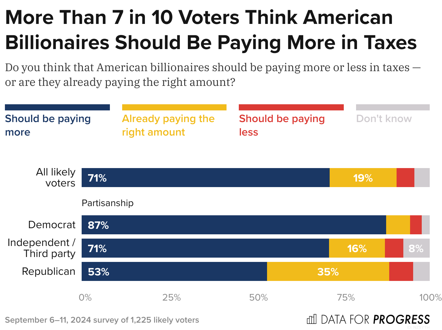 From September 6 to 11, 2024, Data for Progress surveyed national likely voters to measure support for tax rates on the wealthiest Americans. More than 7 in 10 likely voters, including 87% of Democrats, 71% of Independents, and 53% of Republicans, think American billionaires should be paying more in taxes.