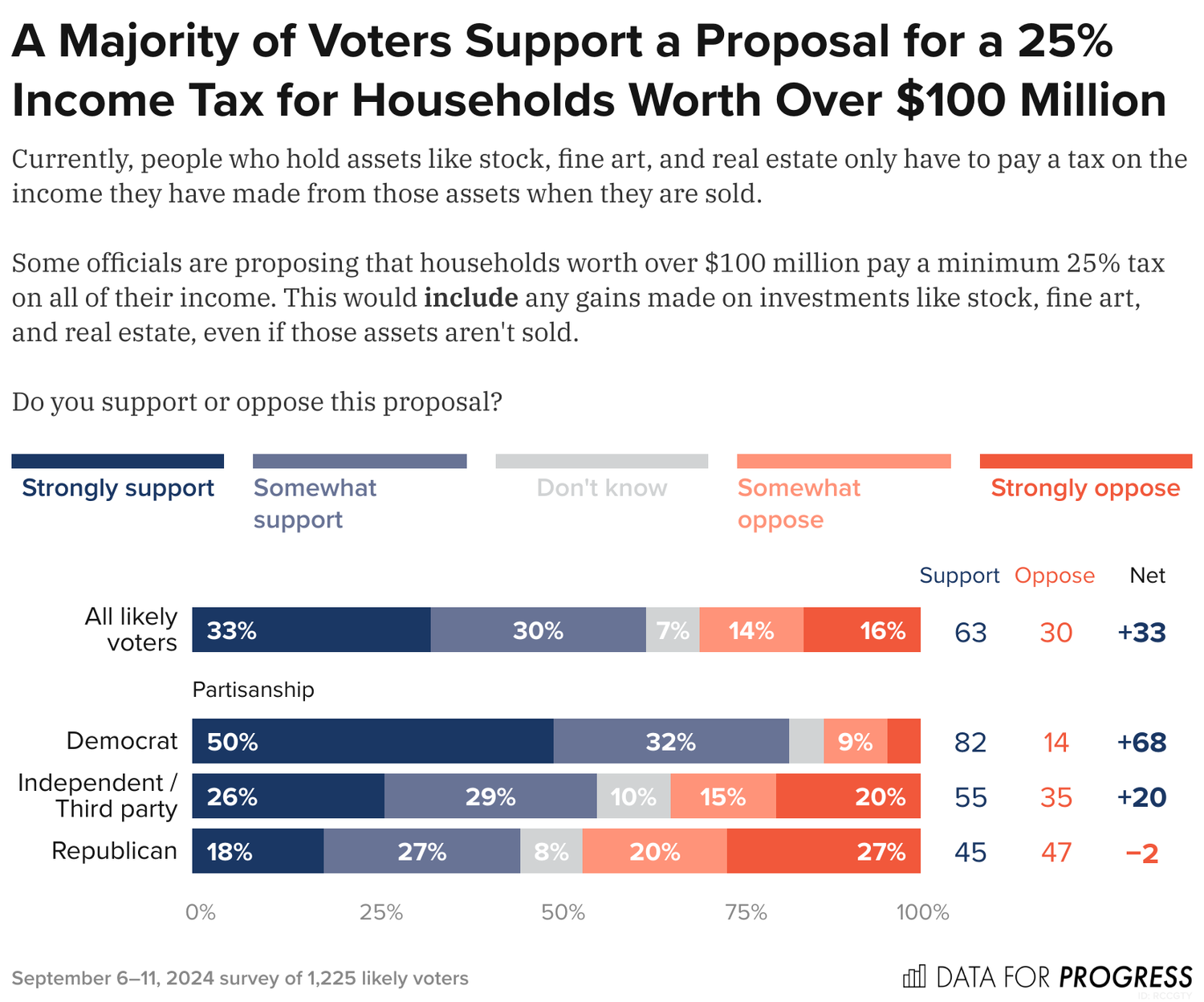 A majority of voters, including 82% of Democrats and 55% of Independents, support this proposal for a minimum 25% tax on the incomes of households worth over $100 million.