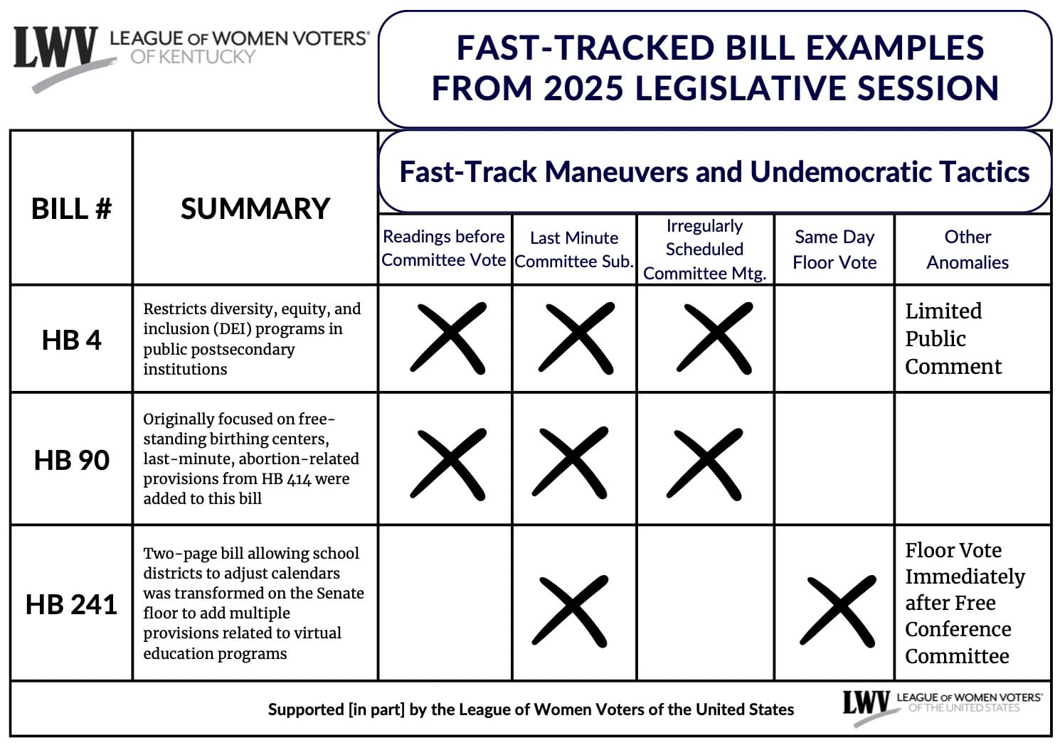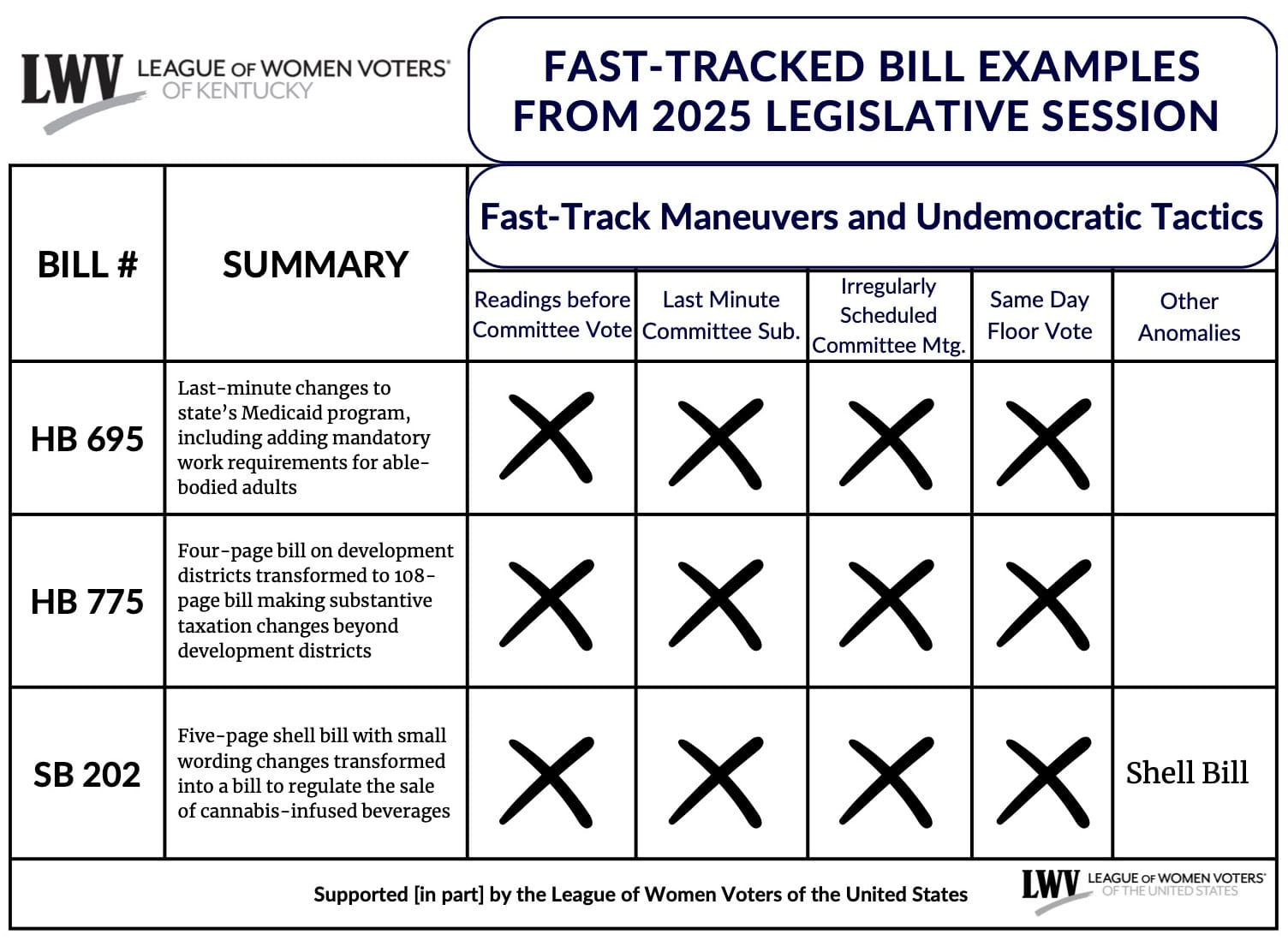 - Jones proceeded to go into detail about the legislative procedures that caused the League to hold the rally. She pointed out the charts on display at the front, showing examples of bills that had been mishandled by leadership and fast-tracked to passage using undemocratic tactics such as: